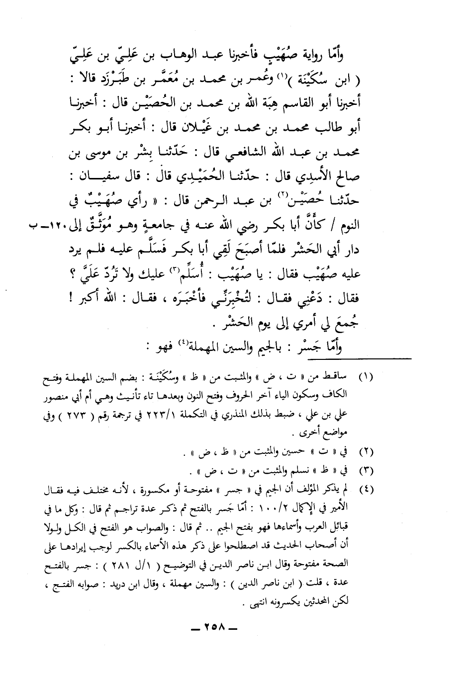 وَأما رِوَايَة صُهَيْب فَأخْبرنَا عبد الْوَهَّاب بن عَليّ بن عَليّ ابْن سكينَة وَعمر بن مُحَمَّد بن معمر بن طبرزد قَالَا اُخْبُرْنَا أَبُو الْقَاسِم هبة الله بن مُحَمَّد بن الْحصين قَالَ أخبرنَا أَبُو طَالب مُحَمَّد بن مُحَمَّد بن غيلَان قَالَ أخبرنَا أَبُو بكر مُحَمَّد بن عبد الله الشَّافِعِي قَالَ حَدثنَا بشر بن مُوسَى بن صَالح الْأَسدي قَالَ حَدثنَا الْحميدِي قَالَ قَالَ سُفْيَان حَدثنَا حُصَيْن بن عبد الرَّحْمَن قَالَ رَأْي صُهَيْب فِي النّوم كَأَن أَبَا بكر رَضِي الله عَنهُ فِي جَامِعَة وَهُوَ موثق إِلَى دَار ابي الْحَشْر فَلَمَّا أصبح لَقِي أَبَا بكر فَسلم عَلَيْهِ فَلم يرد عَلَيْهِ صُهَيْب فَقَالَ يَا صُهَيْب أسلم عَلَيْك وَلَا ترد عَليّ فَقَالَ دَعْنِي فَقَالَ لتخبرني فَأخْبرهُ فَقَالَ الله اكبر جمع لي أَمْرِي إِلَى يَوْم الْحَشْر