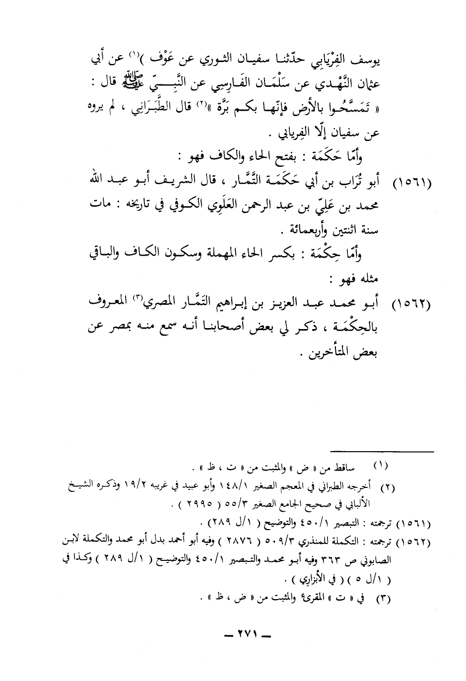 1561 - أَبُو تُرَاب بن ابي حِكْمَة التمار قَالَ الشريف أَبُو عبد الله مُحَمَّد بن عَليّ بن عبد الرَّحْمَن الْعلوِي الْكُوفِي فِي تَارِيخه مَاتَ سنة اثْنَتَيْنِ وَأَرْبَعمِائَة