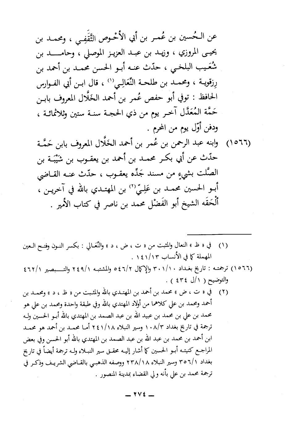 1566 - وَابْنه عبد الرَّحْمَن بن عمر بن أَحْمد الْخلال الْمَعْرُوف بِابْن حمة حدث عَن أبي بكر مُحَمَّد بن أَحْمد بن يَعْقُوب بن شيبَة بن الصَّلْت بِشَيْء من مُسْند جده يَعْقُوب حدث عَنهُ القَاضِي أَبُو الْحُسَيْن مُحَمَّد بن عَليّ بن الْمُهْتَدي بِاللَّه فِي آخَرين الْحَقْهُ الشَّيْخ أَبُو الْفضل مُحَمَّد بن نَاصِر فِي كتاب الْأَمِير