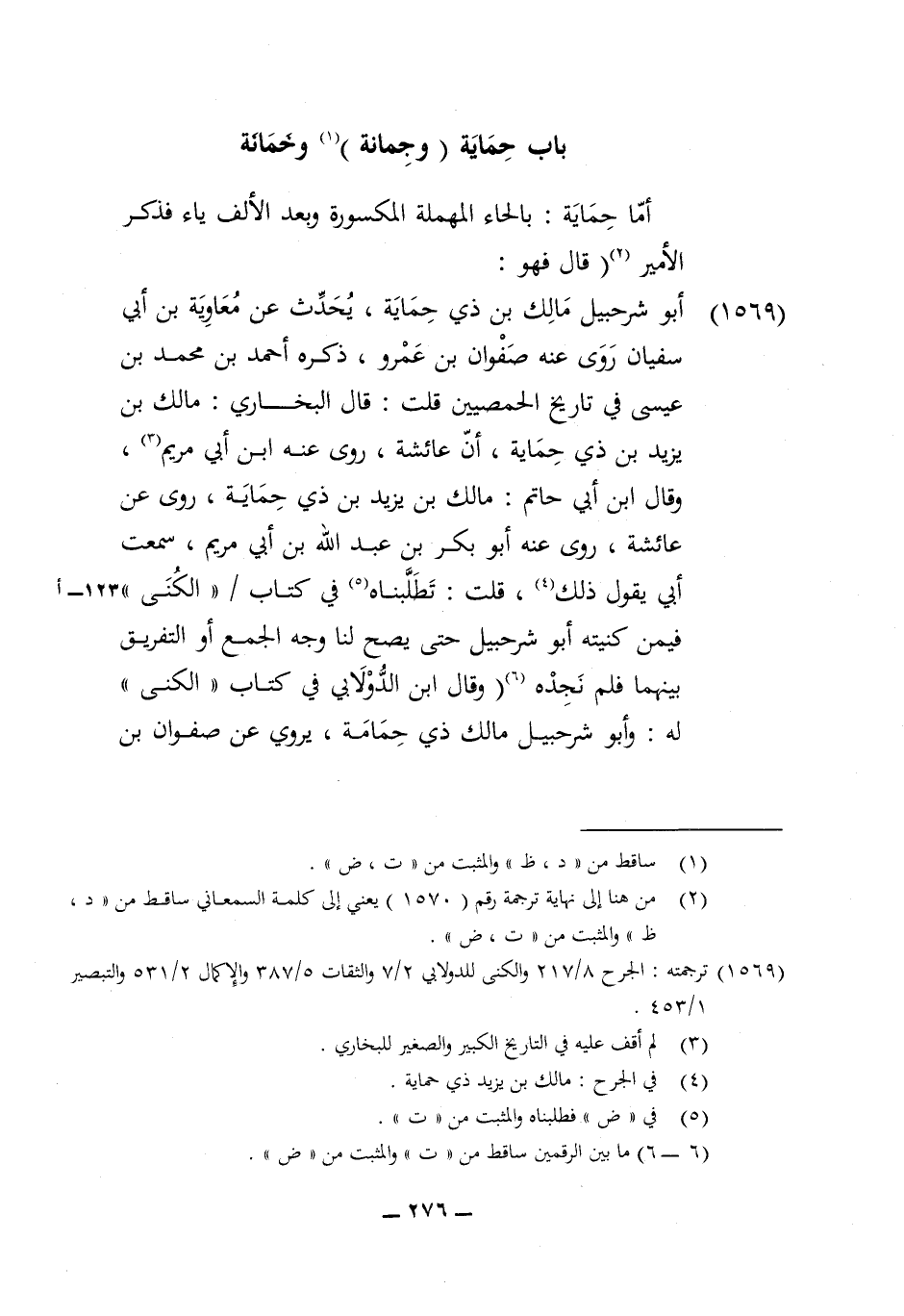 1569 - أَبُو شُرَحْبِيل مَالك بن ذِي حماية يحدث عَن مُعَاوِيَة بن أبي سُفْيَان روى عَنهُ صَفْوَان بن عَمْرو ذكره أَحْمد بن مُحَمَّد بن عِيسَى فِي تَارِيخ الحمصيين قلت قَالَ البُخَارِيّ مَالك بن يزِيد بن ذِي حماية أَن عَائِشَة روى عَنهُ ابْن أبي مَرْيَم وَقَالَ ابْن أبي حَاتِم مَالك بن يزِيد بن ذِي حماية روى عَن عَائِشَة روى عَنهُ أَبُو بكر بن عبد الله بن أبي مَرْيَم سَمِعت أبي يَقُول ذَلِك قلت تطلبناه فِي كتاب الكنى فِيمَن كنيته أَبُو شُرَحْبِيل حَتَّى يَصح لنا وَجه الْجمع أَو التَّفْرِيق بَينهمَا فَلم نجده وَقَالَ ابْن الدولابي فِي كتاب الكنى لَهُ وَأَبُو شُرَحْبِيل مَالك ذِي حمامة يروي عَن صَفْوَان بن