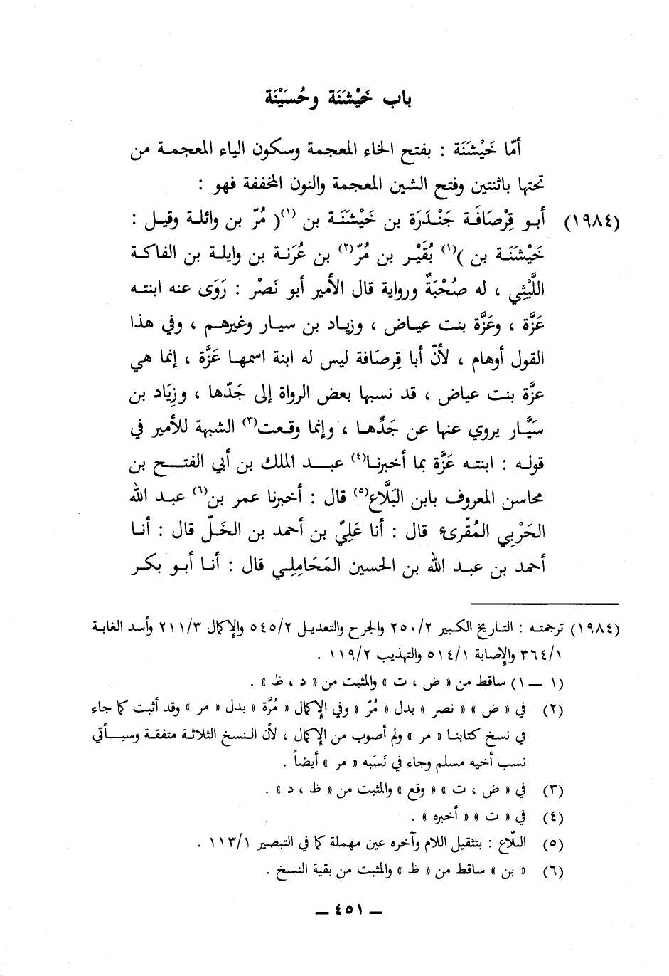 1984 - أَبُو قرصافة جندرة بن خيشنة بن مر بن وائلة وَقيل خيشنة بن بقير بن مر بن عُرَنَة بن وايلة بن الفاكة اللَّيْثِيّ لَهُ صُحْبَة وَرِوَايَة قَالَ الْأَمِير أَبُو نصر روى عَنهُ ابْنَته عزة وَعزة بنت عِيَاض وَزِيَاد بن سيار وَغَيرهم وَفِي هَذَا القَوْل أَوْهَام لِأَن أَبَا قرصافة لَيْسَ لَهُ ابْنة اسْمهَا عزة إِنَّمَا هِيَ عزة بنت عِيَاض قد نَسَبهَا بعض الروَاة إِلَى جدها وَزِيَاد بن سيار يروي عَنْهَا عَن جدها وَإِنَّمَا وَقعت الشُّبْهَة للأمير فِي قَوْله ابْنَته عزة بِمَا أخبرنَا عبد الْملك بن أبي الْفَتْح بن محَاسِن الْمَعْرُوف بِابْن البلاع قَالَ أخبرنَا عمر بن عبد الله الْحَرْبِيّ المقرىء قَالَ أَنا عَليّ بن أَحْمد بن الْخلّ قَالَ أَنا أَحْمد بن عبد الله بن الْحُسَيْن الْمحَامِلِي قَالَ أَنا أَبُو بكر