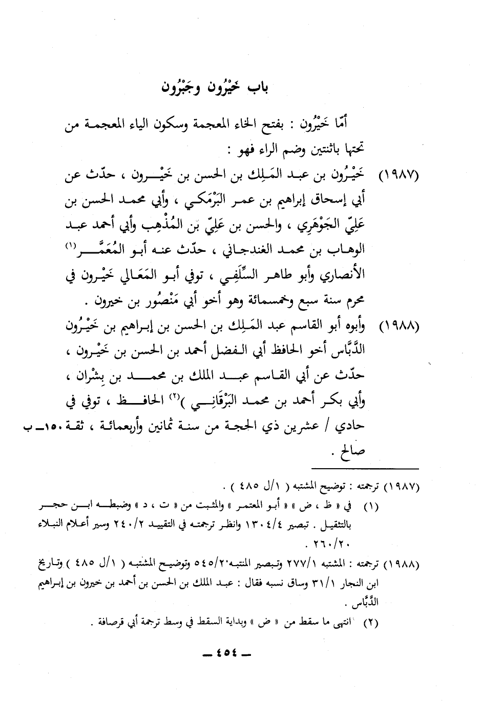 1987 - خيرون بن عبد الْملك بن الْحسن بن خيرون حدث عَن أبي إِسْحَاق إِبْرَاهِيم بن عمر الْبَرْمَكِي وَأبي مُحَمَّد الْحسن بن عَليّ الْجَوْهَرِي وَالْحسن بن عَليّ بن الْمَذْهَب وَأبي أَحْمد عبد الْوَهَّاب بن مُحَمَّد الغندجاني حدث عَنهُ أَبُو المعمر الْأنْصَارِيّ وَأَبُو طَاهِر السلَفِي توفّي أَبُو الْمَعَالِي خيرون فِي محرم سنة سبع وَخَمْسمِائة وَهُوَ أَخُو أبي مَنْصُور بن خيرون