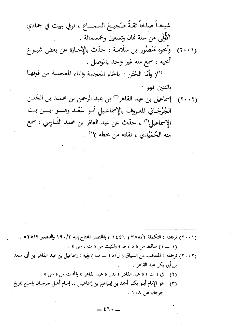 2002 - إِسْمَاعِيل بن عبد القاهر بن عبد الرَّحْمَن بن مُحَمَّد بن الختن الْجِرْجَانِيّ الْمَعْرُوف بالإسماعيلي ابو سعد وَهُوَ ابْن بنت الْإِسْمَاعِيلِيّ حدث عَن عبد الغافر بن مُحَمَّد الْفَارِسِي سمع مِنْهُ الْحميدِي نقلته من خطه