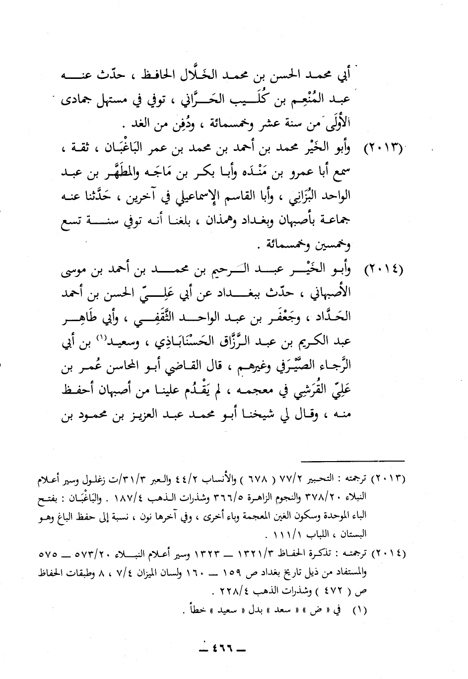 2014 - وَأَبُو الْخَيْر عبد الرَّحِيم بن مُحَمَّد بن أَحْمد بن مُوسَى الْأَصْبَهَانِيّ حدث بِبَغْدَاد عَن أبي عَليّ الْحسن بن أَحْمد الْحداد وجعفر بن عبد الْوَاحِد الثَّقَفِيّ وابي طَاهِر عبد الْكَرِيم بن عبد الرَّزَّاق الحسناباذي وَسَعِيد بن أبي الرَّجَاء الصَّيْرَفِي وَغَيرهم قَالَ القَاضِي أَبُو المحاسن عمر بن عَليّ الْقرشِي فِي مُعْجَمه لم يقدم علينا من أَصْبَهَان أحفظ مِنْهُ وَقَالَ لي شَيخنَا أَبُو مُحَمَّد عبد الْعَزِيز بن مَحْمُود بن