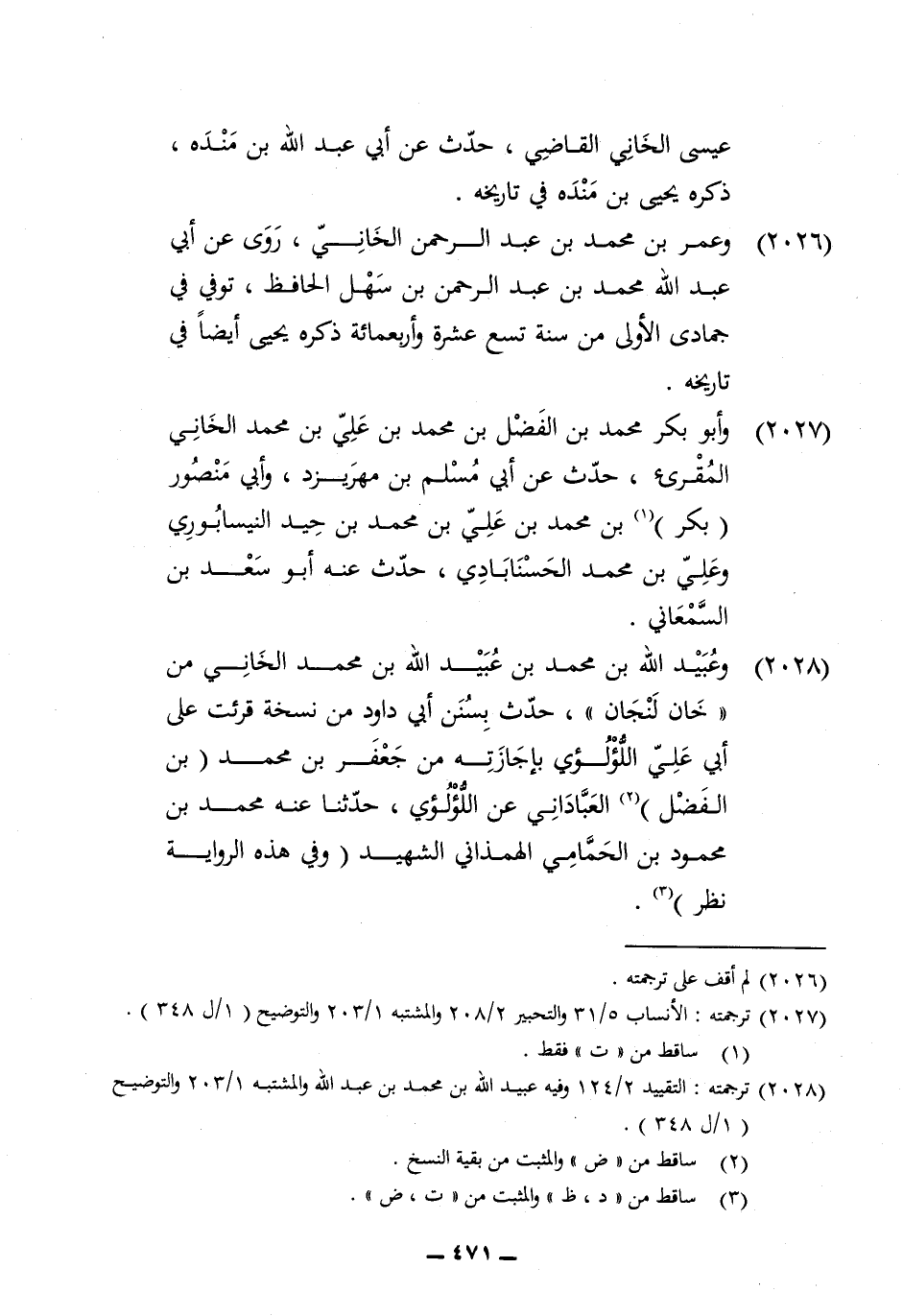 2028 - وَعبيد الله بن مُحَمَّد بن عبيد الله بن مُحَمَّد الخاني من خَان لنجان حدث بسنن ابي دَاوُد من نُسْخَة قُرِئت على أبي عَليّ اللؤْلُؤِي بإجازاته من جَعْفَر بن مُحَمَّد بن الْفضل الْعَبادَانِي عَن اللؤْلُؤِي حَدثنَا عَنهُ مُحَمَّد بن مَحْمُود بن الحمامي الهمذاني الشَّهِيد وَفِي هَذِه الرِّوَايَة نظر
