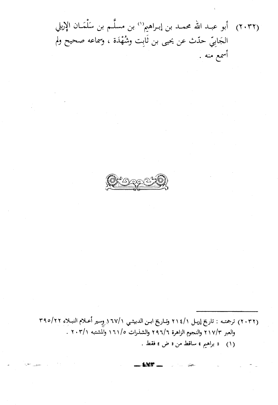 2032 - أَبُو عبد الله مُحَمَّد بن إِبْرَاهِيم بن مُسلم بن سلمَان الإربلي الجابي حدث عَن يحيى بن ثَابت وشهدة وسماعه صَحِيح وَلم أسمع مِنْهُ