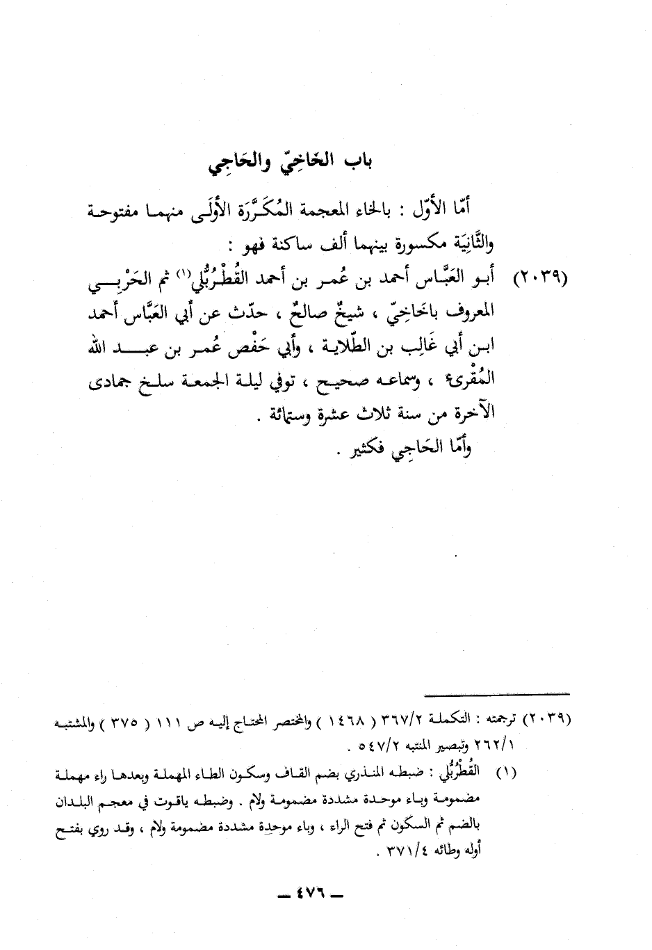 2039 - أَبُو الْعَبَّاس أَحْمد بن عمر بن أَحْمد القطربلي ثمَّ الْحَرْبِيّ الْمَعْرُوف باخاخي شيخ صَالح حدث عَن أبي الْعَبَّاس أَحْمد ابْن أبي غَالب بن الطلابة وابي حَفْص عمر بن عبد الله المقرىء وسماعه صَحِيح توفّي لَيْلَة الْجُمُعَة سلخ جُمَادَى الْآخِرَة من سنة ثَلَاث عشرَة وسِتمِائَة