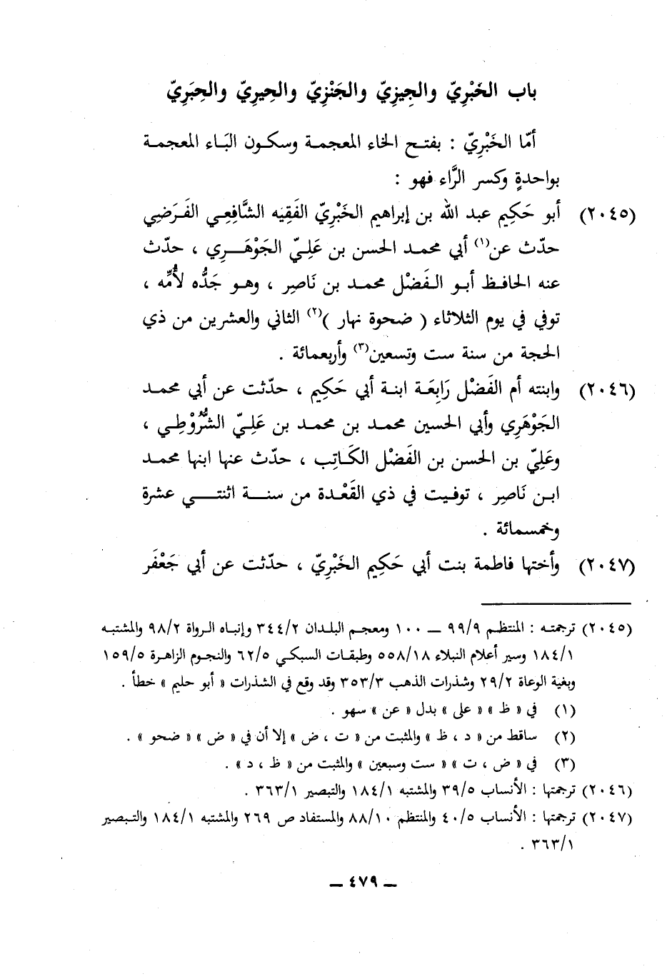 2045 - أَبُو حَكِيم عبد الله بن إِبْرَاهِيم الخبري الْفَقِيه الشَّافِعِي الفرضي حدث عَن أبي مُحَمَّد الْحسن بن عَليّ الْجَوْهَرِي حدث عَنهُ الْحَافِظ أَبُو الْفضل مُحَمَّد بن نَاصِر وَهُوَ جده لأمه توفّي فِي يَوْم الثُّلَاثَاء ضحوة نَهَار الثَّانِي وَالْعِشْرين من ذِي الْحجَّة من سنة سِتّ وَتِسْعين وَأَرْبَعمِائَة
