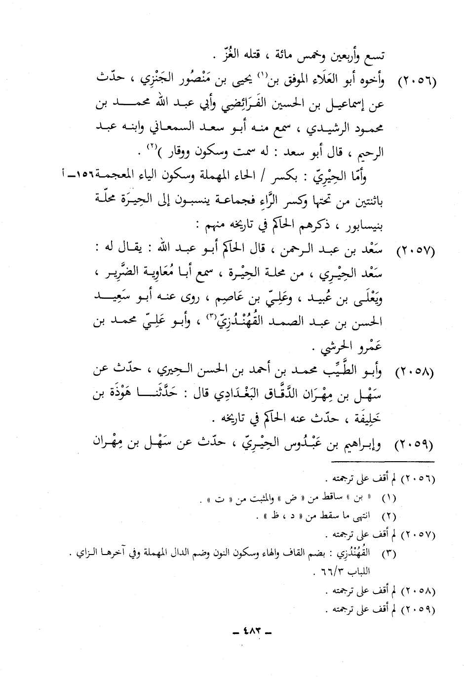 2057 - سعد بن عبد الرَّحْمَن قَالَ الْحَاكِم أَبُو عبد الله يُقَال لَهُ سعد الْحِيرِي من محلّة الْحيرَة سمع أَبَا مُعَاوِيَة الضَّرِير ويعلى بن عبيد وَعلي بن عَاصِم روى عَنهُ أَبُو سعيد الْحسن بن عبد الصَّمد القهندزي وَأَبُو عَليّ مُحَمَّد بن عَمْرو الْحَرَشِي