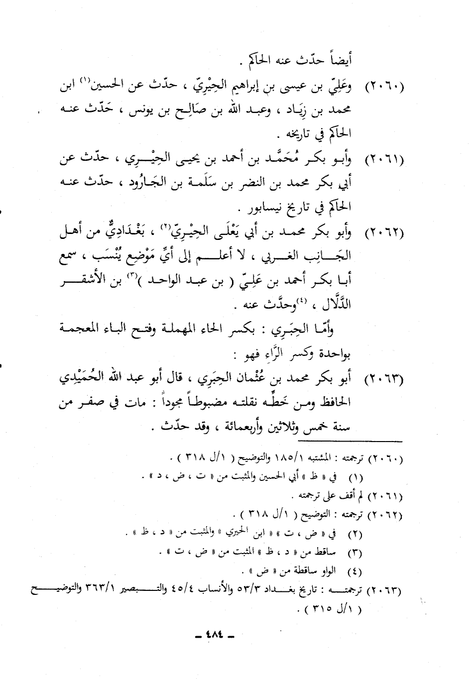 2063 - أَبُو بكر مُحَمَّد بن عُثْمَان الْحبرِي قَالَ أَبُو عبد الله الْحميدِي الْحَافِظ وَمن خطه نقلته مضبوطا مجودا مَاتَ فِي صفر من سنة خمس وَثَلَاثِينَ واربعمائة وَقد حدث