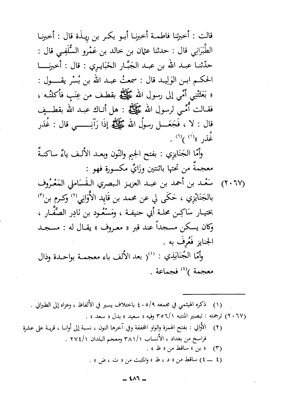 2067 - سعد بن أَحْمد بن عبد الْعَزِيز الْبَصْرِيّ القساملي الْمَعْرُوف بالجنايزي حكى لي عَن مُحَمَّد بن قايد الْأَوَانِي وكرم بن بختيار سَاكن محلّة أبي حنيفَة ومسعود بن نَادِر الصفار وَكَانَ يسكن مَسْجِدا عِنْد قبر مَعْرُوف يُقَال لَهُ مَسْجِد الجنايز فَعرف بِهِ