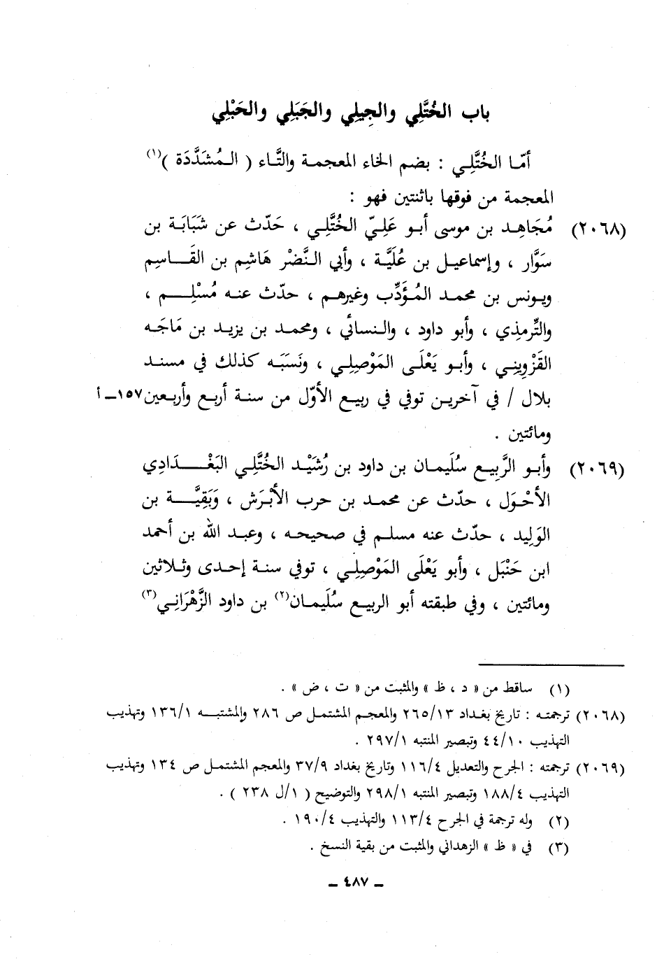 2068 - مُجَاهِد بن مُوسَى أَبُو عَليّ الْخُتلِي حدث عَن شَبابَة بن سوار وَإِسْمَاعِيل بن علية وَأبي النَّضر هَاشم بن الْقَاسِم وَيُونُس بن مُحَمَّد الْمُؤَدب وَغَيرهم حدث عَنهُ مُسلم وَالتِّرْمِذِيّ وابو دَاوُد وَالنَّسَائِيّ وَمُحَمّد بن يزِيد بن مَاجَه الْقزْوِينِي وابو يعلى الْموصِلِي وَنسبه كَذَلِك فِي مُسْند بِلَال فِي آخَرين توفّي فِي ربيع الأول من سنة ارْبَعْ وَأَرْبَعين وَمِائَتَيْنِ