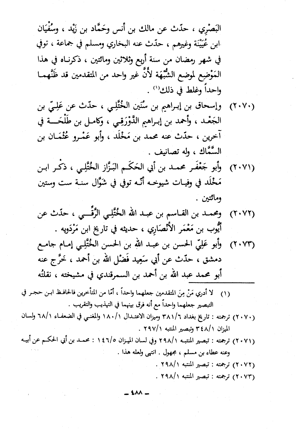 2070 - وَإِسْحَاق بن إِبْرَاهِيم بن سِنِين الْخُتلِي حدث عَن عَليّ بن الْجَعْد وَأحمد بن إِبْرَاهِيم الدَّوْرَقِي وكامل بن طَلْحَة فِي آخَرين حدث عَنهُ مُحَمَّد بن مخلد وَأَبُو عَمْرو عُثْمَان بن السماك وَله تصانيف