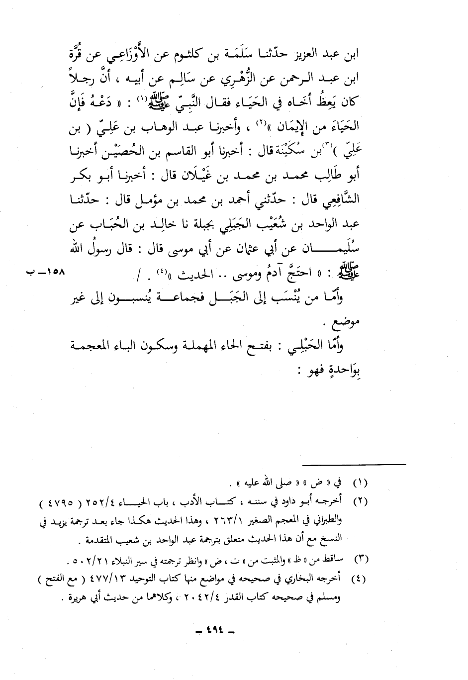 ابْن عبد الْعَزِيز حَدثنَا سَلمَة بن كُلْثُوم عَن الْأَوْزَاعِيّ عَن قُرَّة ابْن عبد الرَّحْمَن عَن الزُّهْرِيّ عَن سَالم عَن ابيه أَن رجلا كَانَ يعظ أَخَاهُ فِي الْحيَاء فَقَالَ النَّبِي صلى الله عَلَيْهِ وَسلم دَعه فَإِن الْحيَاء من الْإِيمَان وَأخْبرنَا عبد الْوَهَّاب بن عَليّ بن عَليّ بن سكينَة قَالَ أخبرنَا أَبُو الْقَاسِم بن الْحصين أخبرنَا أَبُو طَالب مُحَمَّد بن مُحَمَّد بن غيلَان قَالَ أخبرنَا أَبُو بكر الشَّافِعِي قَالَ حَدثنِي أَحْمد بن مُحَمَّد بن مُؤَمل قَالَ حَدثنَا عبد الْوَاحِد بن شُعَيْب الْجبلي بجبلة نَا خَالِد بن الْحباب عَن سُلَيْمَان عَن أبي عُثْمَان عَن أبي مُوسَى قَالَ قَالَ رَسُول الله صلى الله عَلَيْهِ وَسلم احْتج آدم ومُوسَى الحَدِيث