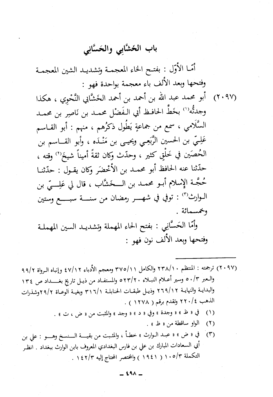 2097 - أَبُو مُحَمَّد عبد الله بن أَحْمد بن أَحْمد الخشابي النَّحْوِيّ هَكَذَا وجدته بِخَط الْحَافِظ ابي الْفضل مُحَمَّد بن نَاصِر بن مُحَمَّد السلَامِي سمع من جمَاعَة يطول ذكرهم مِنْهُم أَبُو الْقَاسِم عَليّ بن الْحُسَيْن الربعِي وَيحيى بن مَنْدَه وَأَبُو الْقَاسِم بن الْحصين فِي خلق كثير وَحدث وَكَانَ ثِقَة أَمينا شيخ وقته حَدثنَا عَنهُ الْحَافِظ أَبُو مُحَمَّد بن الْأَخْضَر وَكَانَ يَقُول حَدثنَا حجَّة الْإِسْلَام أَبُو مُحَمَّد بن الخشاب قَالَ لي عَليّ بن الْوَارِث توفّي فِي شهر رَمَضَان من سنة سبع وَسِتِّينَ وَخَمْسمِائة