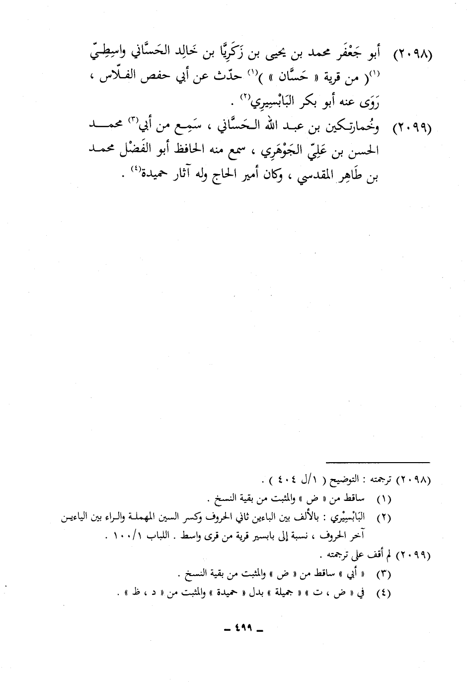 2098 - ابو جَعْفَر مُحَمَّد بن يحيى بن زَكَرِيَّا بن خَالِد الحساني واسطي من قَرْيَة حسان حدث عَن أبي حَفْص الفلاس روى عَنهُ أَبُو بكر البابسيري