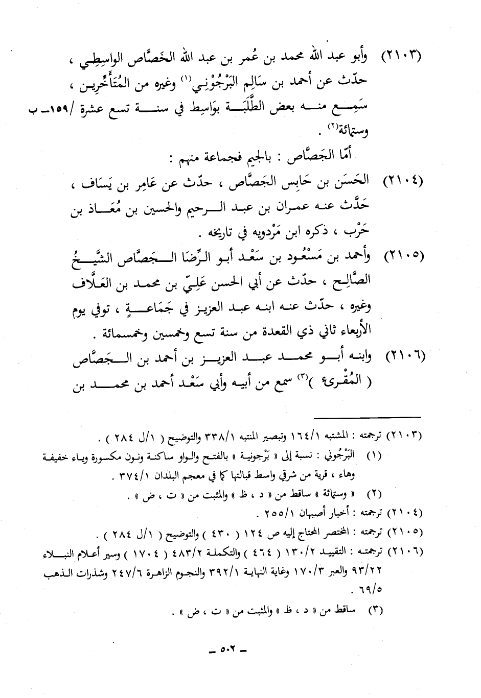 2103 - وَأَبُو عبد الله مُحَمَّد بن عمر بن عبد الله الخصاص الوَاسِطِيّ حدث عَن أَحْمد بن سَالم البرجوني وَغَيره من الْمُتَأَخِّرين سمع مِنْهُ بعض الطّلبَة بواسط فِي سنة تسع عشرَة وسِتمِائَة