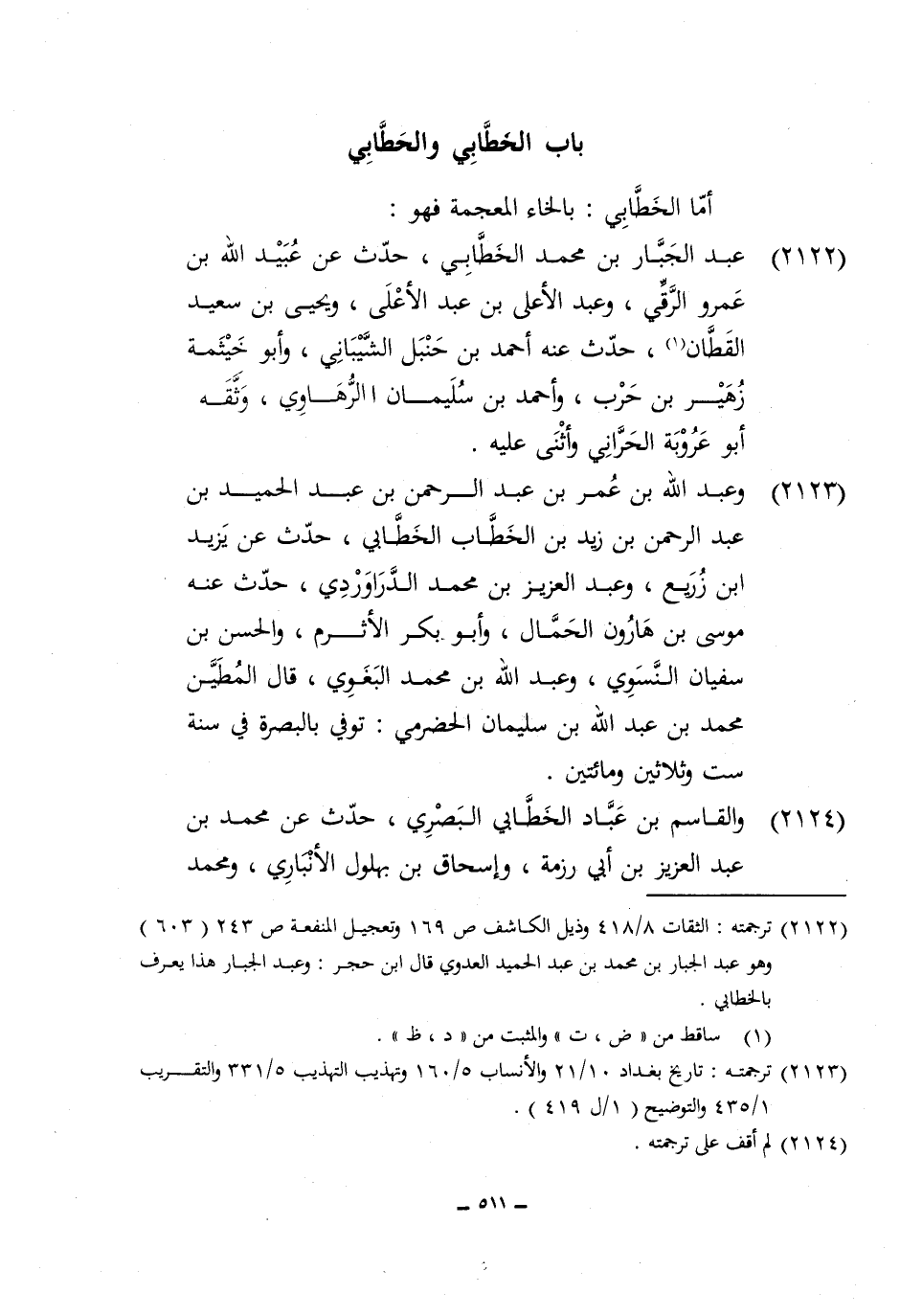 2122 - عبد الْجَبَّار بن مُحَمَّد الْخطابِيّ حدث عَن عبيد الله بن عَمْرو الرقي وَعبد الْأَعْلَى بن عبد الْأَعْلَى وَيحيى بن سعيد الْقطَّان حدث عَنهُ أَحْمد بن حَنْبَل الشَّيْبَانِيّ وَأَبُو خَيْثَمَة زُهَيْر بن حَرْب وَأحمد بن سُلَيْمَان الرهاوي وَثَّقَهُ ابو عرُوبَة الْحَرَّانِي وَأثْنى عَلَيْهِ