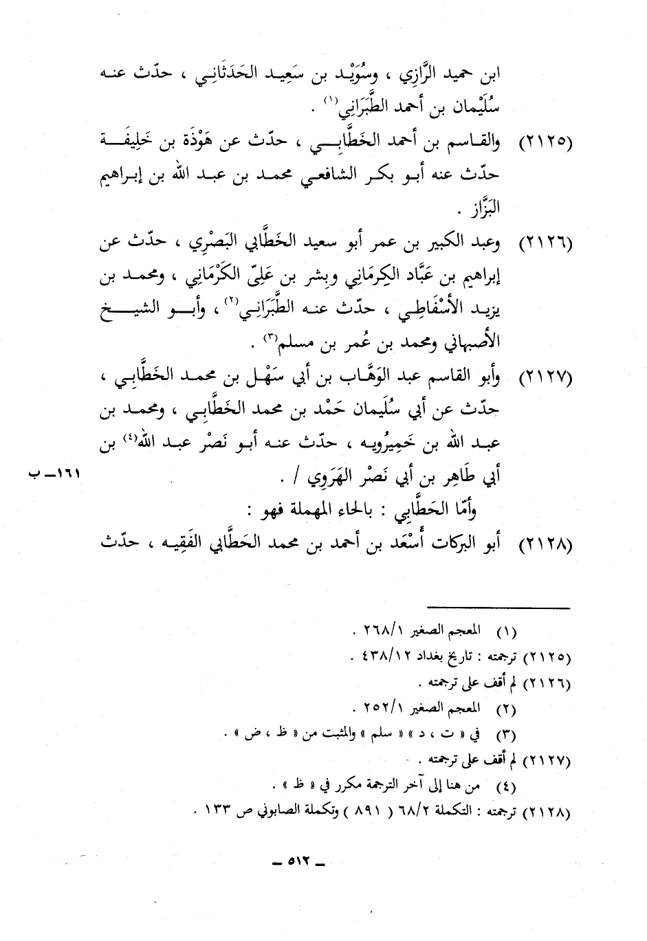 2127 - وَأَبُو الْقَاسِم عبد الْوَهَّاب بن أبي سهل بن مُحَمَّد الْخطابِيّ حدث عَن أبي سُلَيْمَان حمد بن مُحَمَّد الْخطابِيّ وَمُحَمّد بن عبد الله بن خميرويه حدث عَنهُ أَبُو نصر عبد الله بن أبي طَاهِر بن أبي نصر الْهَرَوِيّ