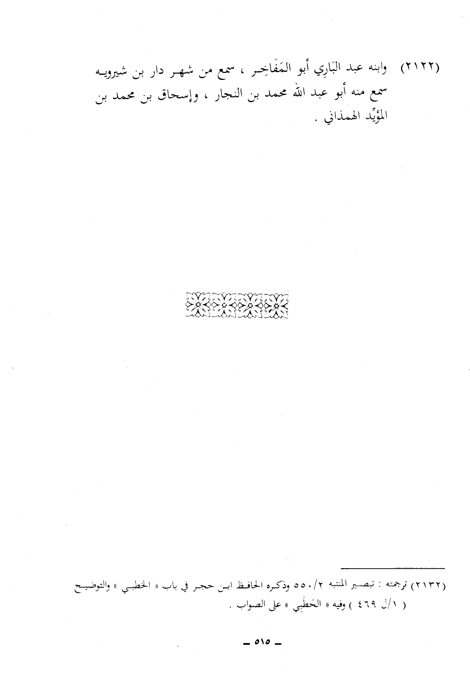 2122 - وَابْنه عبد الْبَارِي أَبُو المفاخر سمع من شهر دَار بن شيرويه سمع مِنْهُ أَبُو عبد الله مُحَمَّد بن النجار وَإِسْحَاق بن مُحَمَّد بن الْمُؤَيد الهمذاني