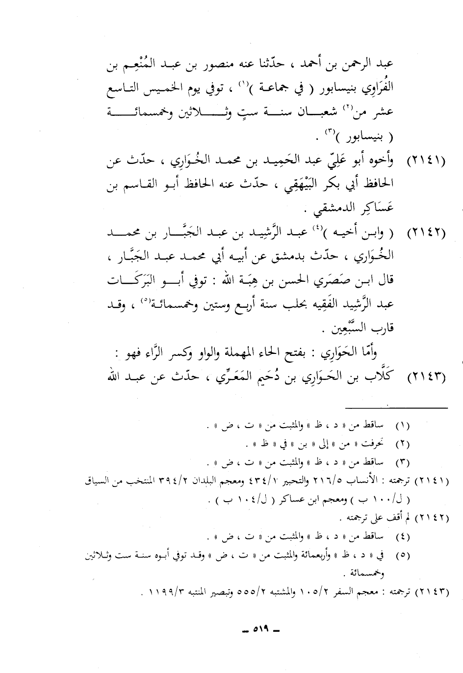 2142 - وَابْن أَخِيه عبد الرشيد بن عبد الْجَبَّار بن مُحَمَّد الخواري حدث بِدِمَشْق عَن أَبِيه ابي مُحَمَّد عبد الْجَبَّار قَالَ ابْن صصري الْحسن بن هبة الله توفّي أَبُو البركات عبد الرشيد الْفَقِيه بجلب سنة أَربع وَسِتِّينَ وَخَمْسمِائة وَقد قَارب السّبْعين وَأما الْحوَاري بِفَتْح الْحَاء الْمُهْملَة وَالْوَاو وَكسر الرَّاء فَهُوَ
