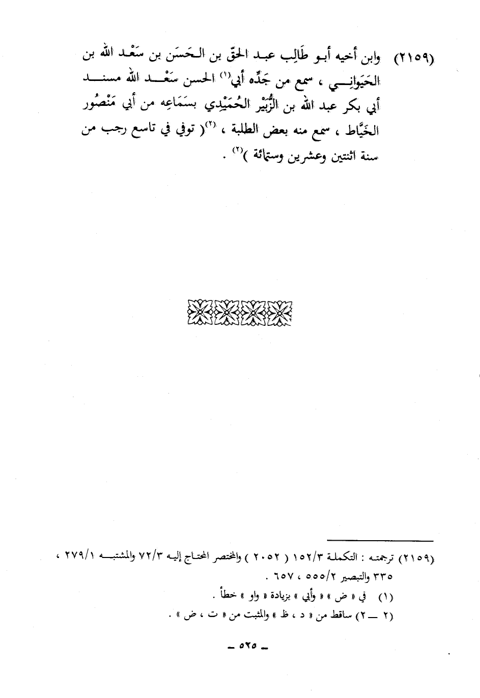 2159 - وَابْن اخيه أَبُو طَالب عبد الْحق بن الْحسن بن سعد الله بن الحيواني سمع من جده أبي الْحسن سعد الله مُسْند ابي بكر عبد الله بن الزبير الْحميدِي بِسَمَاعِهِ من أبي مَنْصُور الْخياط سمع مِنْهُ بعض الطّلبَة توفّي فِي تَاسِع رَجَب من سنة اثْنَتَيْنِ وَعشْرين وسِتمِائَة