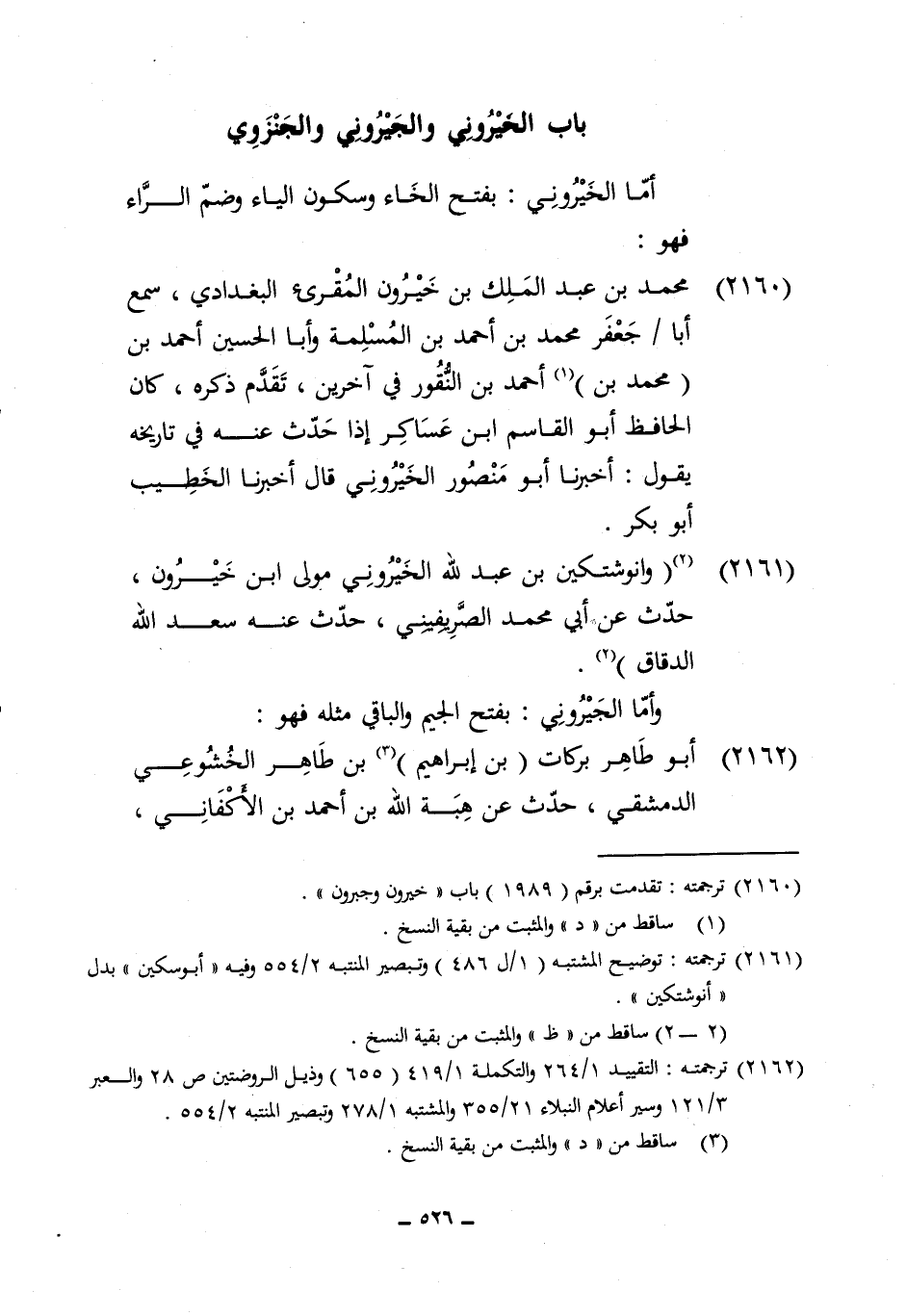 2160 - مُحَمَّد بن عبد الْملك بن خيرون المقرىء الْبَغْدَادِيّ سمع أَبَا جَعْفَر مُحَمَّد بن أَحْمد بن الْمسلمَة وَأَبا الْحُسَيْن أَحْمد بن مُحَمَّد بن أَحْمد بن النفور فِي آخَرين تقدم ذكره كَانَ الْحَافِظ أَبُو الْقَاسِم ابْن عَسَاكِر إِذا حدث عَنهُ فِي تَارِيخه يَقُول أخبرنَا أَبُو مَنْصُور الخيروني قَالَ أخبرنَا الْخَطِيب أَبُو بكر
