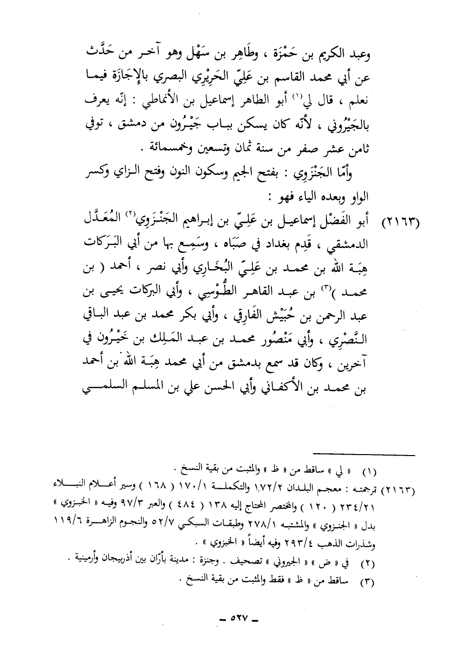 2163 - أَبُو الْفضل إِسْمَاعِيل بن عَليّ بن إِبْرَاهِيم الجنزوي الْمعدل الدِّمَشْقِي قدم بَغْدَاد فِي صباه وَسمع بهَا من أبي البركات هبة الله بن مُحَمَّد بن عَليّ البُخَارِيّ وابي نصر أَحْمد بن مُحَمَّد بن عبد القاهر الطوسي وَأبي البركات يحيى بن عبد الرَّحْمَن بن حُبَيْش الفارقي وَأبي بكر مُحَمَّد بن عبد الْبَاقِي النصري وَأبي مَنْصُور مُحَمَّد بن عبد الْملك بن خيرون فِي آخَرين وَكَانَ قد سمع بِدِمَشْق من أبي مُحَمَّد هبة الله بن أَحْمد بن مُحَمَّد بن الْأَكْفَانِيِّ وَأبي الْحسن عَليّ بن الْمُسلم السّلمِيّ