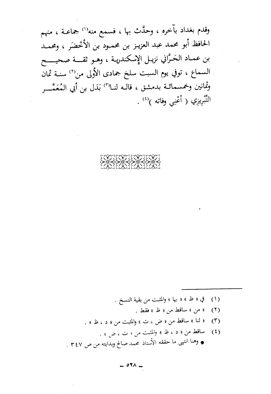 وَقدم بَغْدَاد بِآخِرهِ وَحدث بهَا فَسمع مِنْهُ جمَاعَة مِنْهُم الْحَافِظ ابو مُحَمَّد عبد الْعَزِيز بن مَحْمُود بن الْأَخْضَر وَمُحَمّد بن عماد الْحَرَّانِي نزيل الْإسْكَنْدَريَّة وَهُوَ ثِقَة صَحِيح السماع توفّي يَوْم السبت سلخ جُمَادَى الأول من سنة ثَمَان وَثَمَانِينَ وَخَمْسمِائة بِدِمَشْق قَالَه لنا بدل من أبي المعمر التبريزي اعني وَفَاته