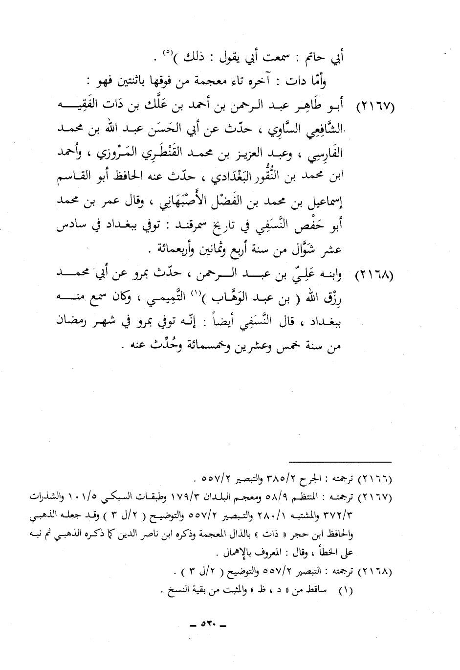 2167 - أَبُو طَاهِر عبد الرَّحْمَن بن أَحْمد بن علك بن دات الْفَقِيه الشَّافِعِي الساوي حدث عَن أبي الْحسن عبد الله بن مُحَمَّد الْفَارِسِي وَعبد الْعَزِيز بن مُحَمَّد الْقَنْطَرِي الْمروزِي وَأحمد بن مُحَمَّد بن النقور الْبَغْدَادِيّ حدث عَنهُ الْحَافِظ أَبُو الْقَاسِم إِسْمَاعِيل بن مُحَمَّد بن الْفضل الْأَصْبَهَانِيّ وَقَالَ عمر بن مُحَمَّد أَبُو حَفْص النَّسَفِيّ فِي تَارِيخ سَمَرْقَنْد توفّي بِبَغْدَاد فِي سادس عشر شَوَّال من سنة أَربع وَثَمَانِينَ واربعمائة