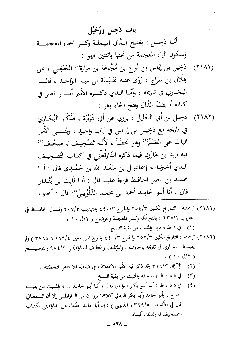 2182 - دخيل بن ابي الْخَلِيل يرْوى عَن أبي هُرَيْرَة فَذكر البُخَارِيّ فِي تَارِيخه مَعَ دخيل بن إِيَاس فِي بَاب وَاحِد وَبنى الْأَمِير الْبَاب على الضَّم وَهُوَ خطأ لِأَنَّهُ تَصْحِيف صحف فِيهِ يزِيد بن هَارُون فِيمَا ذكره الدَّارَقُطْنِيّ فِي كتاب التَّصْحِيف الَّذِي أخبرنَا بِهِ إِسْمَاعِيل بن سعد الله بن حمدي قَالَ أَنا مُحَمَّد بن نَاصِر الْحَافِظ قِرَاءَة عَلَيْهِ قَالَ أَنا ثَابت بن بنْدَار قَالَ أَنا أَبُو حَامِد أَحْمد بن مُحَمَّد الدلويي قَالَ أخبرنَا