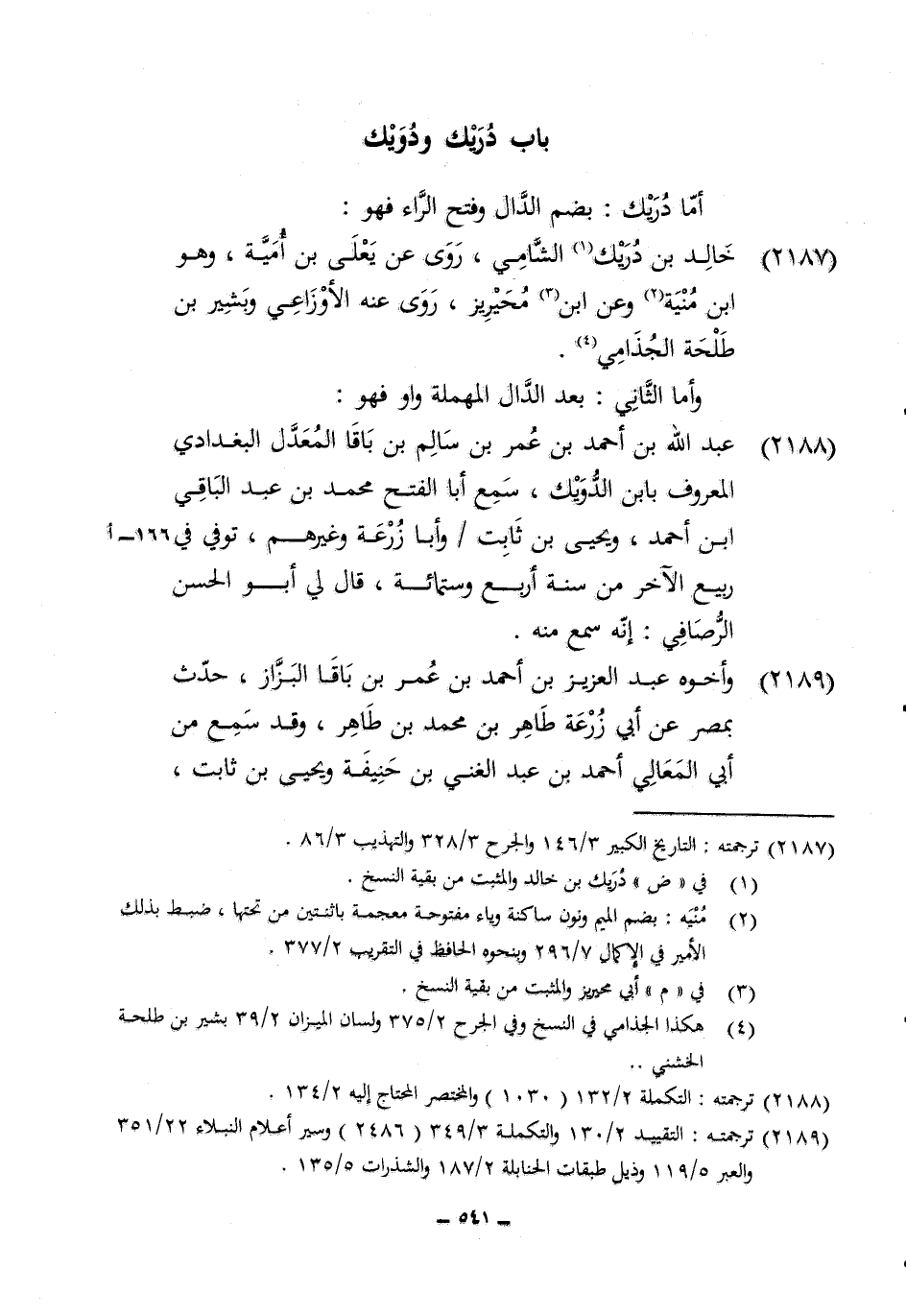 2188 - عبد الله بن أَحْمد بن عمر بن سَالم بن باقا الْمعدل الْبَغْدَادِيّ الْمَعْرُوف بِابْن الدويك سمع ابا الْفَتْح مُحَمَّد بن عبد الْبَاقِي ابْن أَحْمد وَيحيى بن ثَابت وابا زرْعَة وَغَيرهم توفّي فِي ربيع الآخر من سنة ارْبَعْ وسِتمِائَة قَالَ لي أَبُو الْحسن الرصافي إِنَّه سمع مِنْهُ