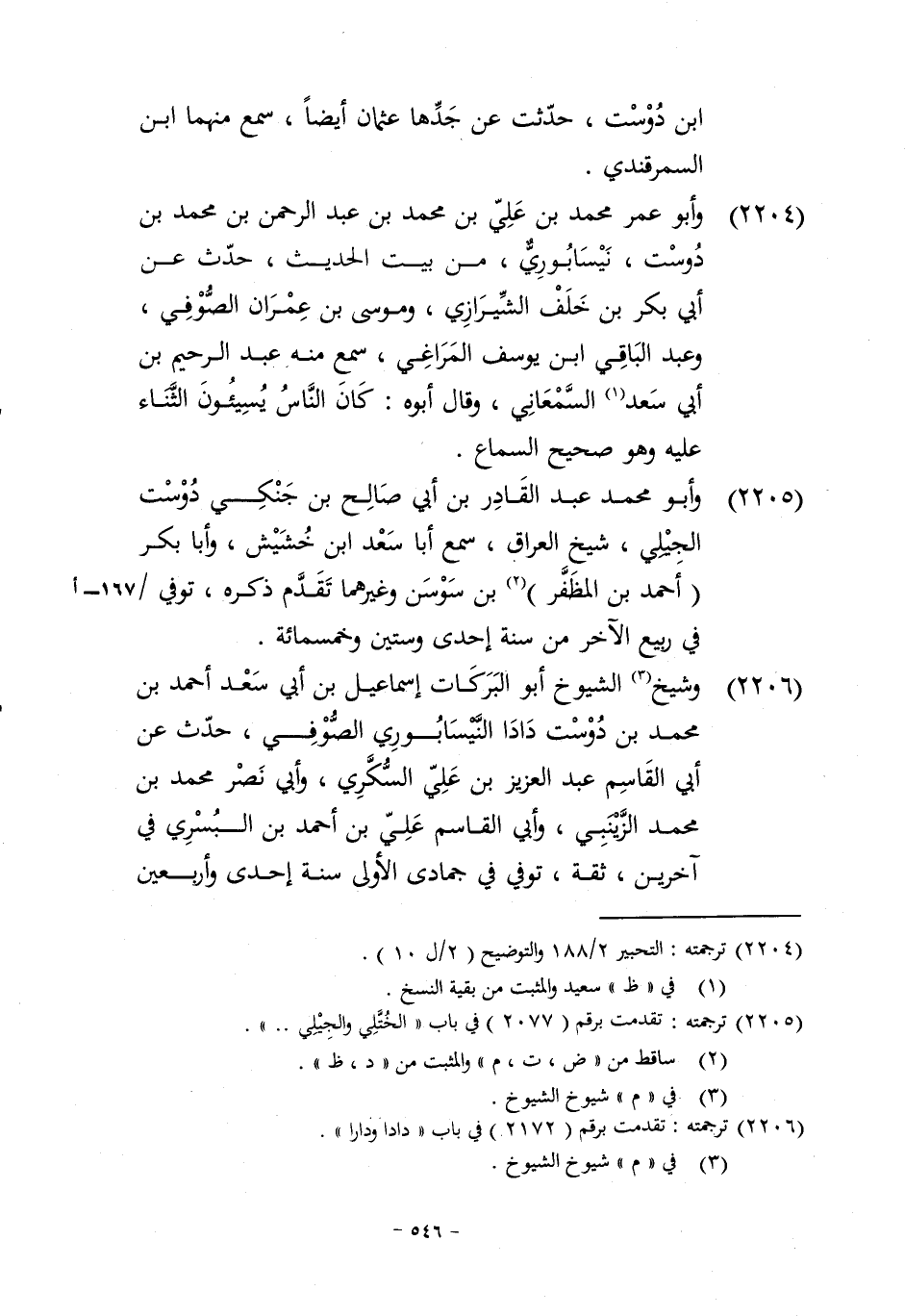 2204 - وَأَبُو عمر مُحَمَّد بن عَليّ بن مُحَمَّد بن عبد الرَّحْمَن بن مُحَمَّد بن دوست نيسابوري من بَيت الحَدِيث حدث عَن أبي بكر بن خلف الشِّيرَازِيّ ومُوسَى بن عمرَان الصُّوفِي وَعبد الْبَاقِي ابْن يُوسُف المراغي سمع مِنْهُ عبد الرَّحِيم بن ابي سعد السَّمْعَانِيّ وَقَالَ أَبوهُ كَانَ النَّاس يسيئون الثَّنَاء عَلَيْهِ وَهُوَ صَحِيح السماع