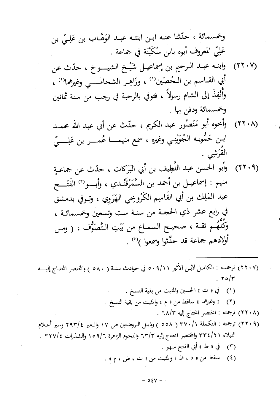 2209 - وَأَبُو الْحسن عبد اللَّطِيف بن أبي البركات حدث عَن جمَاعَة مِنْهُم إِسْمَاعِيل بن أَحْمد بن السَّمرقَنْدِي وَأَبُو الْفَتْح عبد الْملك بن أبي الْقَاسِم الكروخي الْهَرَوِيّ وَتُوفِّي بِدِمَشْق فِي رَابِع عشر ذِي الْحجَّة من سنة سِتّ وَتِسْعين وَخَمْسمِائة وَكلهمْ ثِقَة صَحِيح السماع من بَيت التصوف وَمن أَوْلَادهم جمَاعَة قد حدثوا وسمعوا