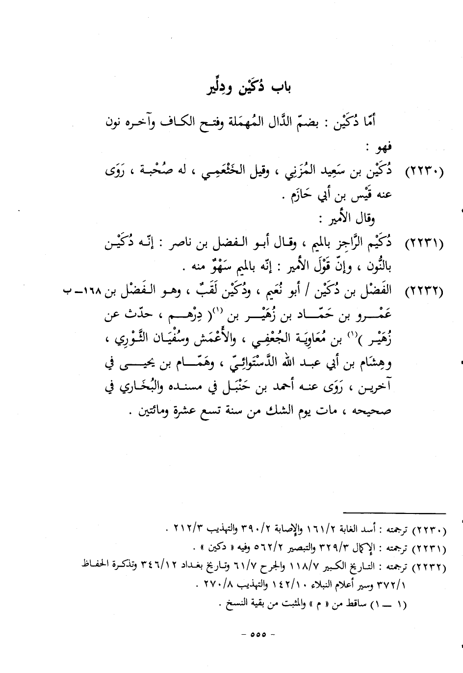 2232 - الْفضل بن دُكَيْن أَبُو نعيم ودكين لقب وَهُوَ الْفضل بن عَمْرو بن حَمَّاد بن زُهَيْر بن دِرْهَم حدث عَن زُهَيْر بن مُعَاوِيَة الْجعْفِيّ وَالْأَعْمَش وسُفْيَان الثَّوْريّ وَهِشَام بن أبي عبد الله الدستوَائي وَهَمَّام بن يحيى فِي آخَرين روى عَنهُ أَحْمد بن حَنْبَل فِي مُسْنده وَالْبُخَارِيّ فِي صَحِيحه مَاتَ يَوْم الشَّك من سنة تسع عشرَة وَمِائَتَيْنِ