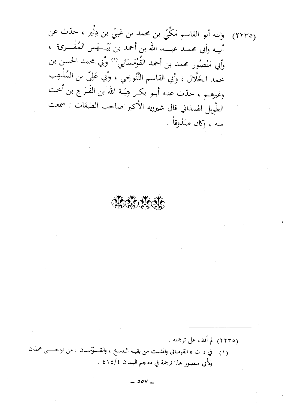 2235 - وَابْنه أَبُو الْقَاسِم مكي بن مُحَمَّد بن عَليّ بن دلير حدث عَن أَبِيه وابي مُحَمَّد عبد الله بن أَحْمد بن بيهس المقرىء وَأبي مَنْصُور مُحَمَّد بن أَحْمد القومساني وَأبي مُحَمَّد الْحسن بن مُحَمَّد الْخلال وَأبي الْقَاسِم التنوخي وَأبي عَليّ بن الْمَذْهَب وَغَيرهم حدث عَنهُ أَبُو بكر هبة الله بن الْفرج بن أُخْت الطَّوِيل الهمذاني قَالَ شيرويه الْأَكْبَر صَاحب الطَّبَقَات سَمِعت مِنْهُ وَكَانَ صَدُوقًا
