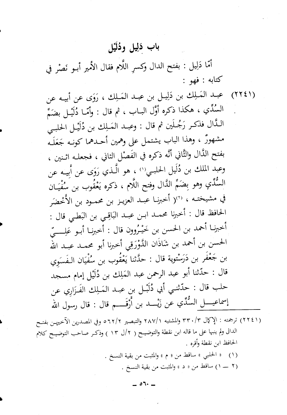 2241 - عبد الْملك بن دَلِيل بن عبد الْملك روى عَنهُ أَبِيه عَن السّديّ هَكَذَا ذكره أول الْبَاب ثمَّ قَالَ وَأما دَلِيل بِضَم الدَّال فَذكر رجلَيْنِ ثمَّ قَالَ وَعبد الْملك بن دَلِيل الْحلَبِي مَشْهُور وَهَذَا الْبَاب يشْتَمل على وهمين أَحدهمَا كَونه جعله بِفَتْح الدَّال وَالثَّانِي أَنه ذكره فِي الْفَصْل الثَّانِي فَجعله اثْنَيْنِ وَعبد الْملك بن دَلِيل الْحلَبِي هُوَ الَّذِي روى عَن أَبِيه عَن السّديّ وَهُوَ بِضَم الدَّال وَفتح اللَّام ذكره يَعْقُوب بن سُفْيَان فِي مشيخته أخبرنَا عبد الْعَزِيز بن مَحْمُود بن الْأَخْضَر الْحَافِظ قَالَ أخبرنَا مُحَمَّد بن عبد الْبَاقِي بن البطي قَالَ أخبرنَا أَحْمد بن الْحسن بن خيروون قَالَ أخبرنَا أَبُو عَليّ الْحسن بن أَحْمد بن شَاذان الدَّوْرَقِي أخبرنَا أَبُو مُحَمَّد عبد الله بن جَعْفَر بن درستوية قَالَ حَدثنَا يَعْقُوب بن سُفْيَان الْفَسَوِي قَالَ حَدثنَا أَبُو عبد الرَّحْمَن عبد الْملك بن دَلِيل إِمَام مَسْجِد حلب قَالَ حَدثنِي أبي دلبل بن عبد الْملك الْفَزارِيّ عَن إِسْمَاعِيل السّديّ عَن زيد بن أَرقم قَالَ قَالَ رَسُول الله صلى الله عَلَيْهِ وَسلم