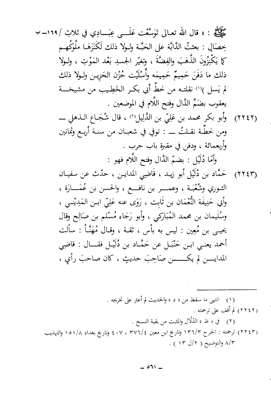 2242 - وَأَبُو بكر مُحَمَّد بن عَليّ بن الدَّلِيل قَالَ شُجَاع الذهلي وَمن خطه نقلت توفّي فِي شعْبَان من سنة أَربع وَثَمَانِينَ وَأَرْبَعمِائَة وَدفن فِي مَقْبرَة بَاب حَرْب وَأما 4 دَلِيل بِضَم الدَّال وَفتح اللَّام فَهُوَ