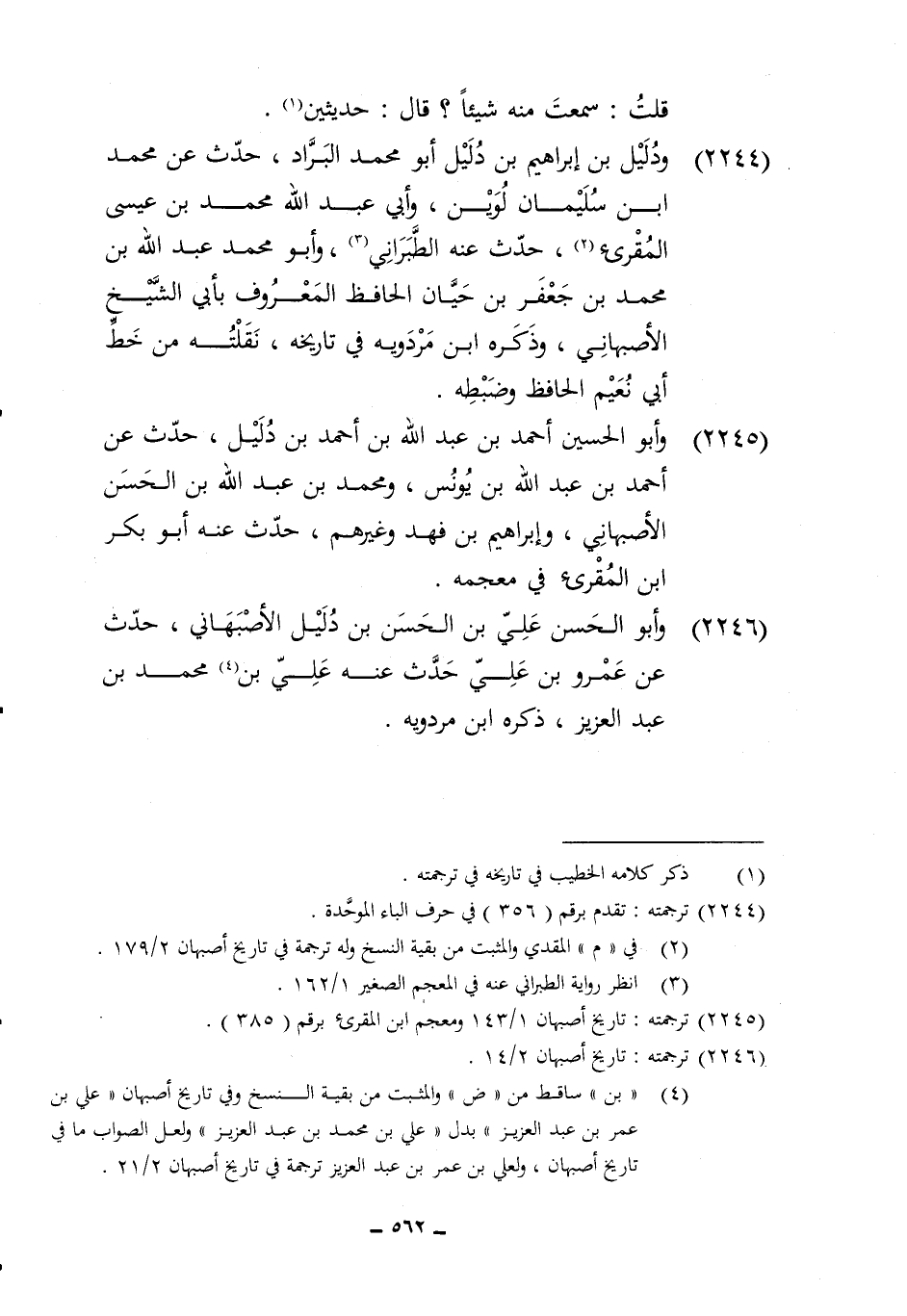2244 - وَدَلِيل بن إِبْرَاهِيم بن دَلِيل أَبُو مُحَمَّد البراد حدث عَن مُحَمَّد بن سُلَيْمَان لوين وَأبي عبد الله مُحَمَّد بن عِيسَى المقرىء حدث عَنهُ الطَّبَرَانِيّ وابو مُحَمَّد عبد الله بن مُحَمَّد بن جَعْفَر بن حَيَّان الْحَافِظ الْمَعْرُوف بِأبي الشَّيْخ الْأَصْبَهَانِيّ وَذكره ابْن مرْدَوَيْه فِي تَارِيخه نقلته من خطّ أبي نعيم الْحَافِظ وَضَبطه
