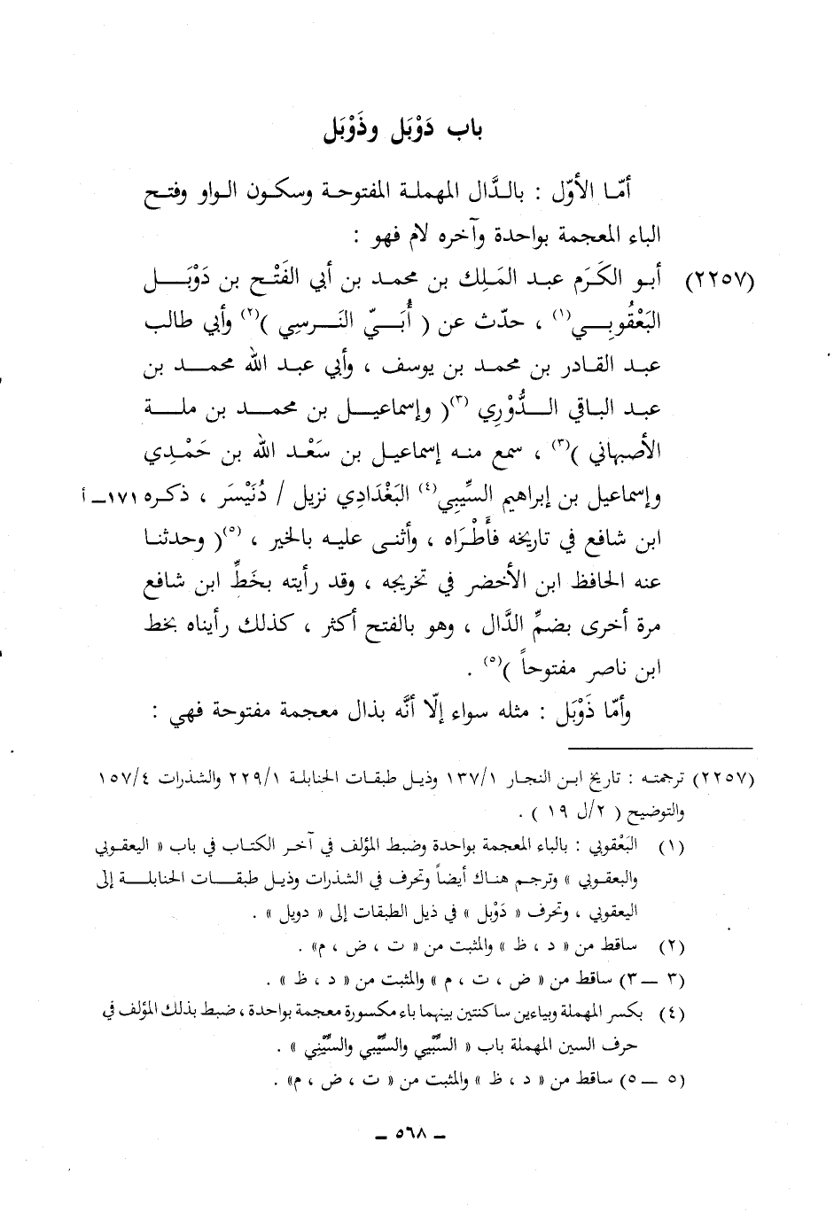 2257 - أَبُو الْكَرم عبد الْملك بن مُحَمَّد بن أبي الْفَتْح بن دوبل البعقوبي حدث عَن أبي النَّرْسِي وَأبي طَالب عبد الْقَادِر بن مُحَمَّد بن يُوسُف وابي عبد الله مُحَمَّد بن عبد الْبَاقِي الدوري وَإِسْمَاعِيل بن مُحَمَّد بن مِلَّة الْأَصْبَهَانِيّ سمع مِنْهُ إِسْمَاعِيل بن سعد الله بن حمدي وَإِسْمَاعِيل بن إِبْرَاهِيم السيبي الْبَغْدَادِيّ نزيل دنيسر ذكره ابْن شَافِع فِي تَارِيخه فأطراه وَأثْنى عَلَيْهِ بِالْخَيرِ وَحدثنَا عَنهُ الْحَافِظ ابْن الْأَخْضَر فِي تَخْرِيجه وَقد رَأَيْته بِخَط ابْن شَافِع مرّة أُخْرَى بِضَم الدَّال وَهُوَ بِالْفَتْح أَكثر كَذَلِك رَأَيْنَاهُ بِخَط ابْن نَاصِر مَفْتُوحًا وَأما ذوبل مثله سَوَاء إِلَّا أَنه بذال مُعْجمَة مَفْتُوحَة فَهُوَ