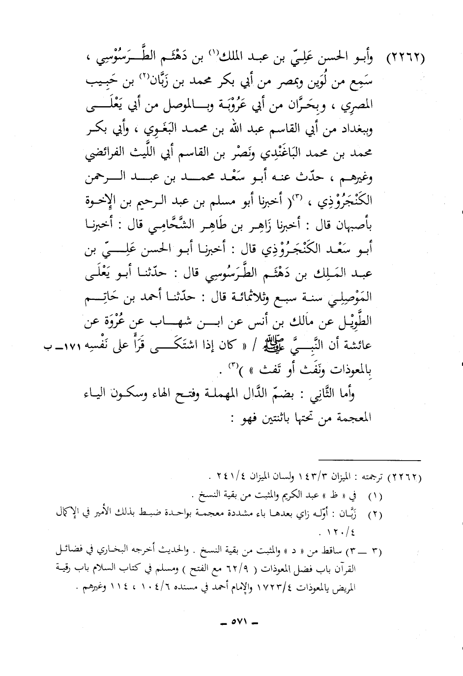 2262 - وَأَبُو الْحسن عَليّ بن عبد الْملك بن دهثم الطرسوسي سمع من لوين وبمصر من أبي بكر مُحَمَّد بن زبان بن حبيب الْمصْرِيّ وبحران من أبي عرُوبَة وبالموصل من أبي يعلى وببغداد من أبي الْقَاسِم عبد الله بن مُحَمَّد الْبَغَوِيّ وَأبي بكر مُحَمَّد بن مُحَمَّد الباغندي وَنصر بن الْقَاسِم أبي اللَّيْث الْفَرَائِضِي وَغَيرهم حدث عَنهُ أَبُو سعد مُحَمَّد بن عبد الرَّحْمَن الكنجروذي أخبرنَا أَبُو مُسلم بن عبد الرَّحِيم بن الْإِخْوَة بأصبهان قَالَ أخبرنَا زَاهِر بن طَاهِر الشحامي قَالَ أخبرنَا ابو سعد الكنجروذي قَالَ أخبرنَا أَبُو الْحسن عَليّ بن عبد الْملك بن دهثم الطرسوسي قَالَ حَدثنَا أَبُو يعلى الْموصِلِي سنة سبع وثلاثمائة قَالَ حَدثنَا أَحْمد بن حَاتِم الطَّوِيل عَن مَالك بن أنس عَن ابْن شهَاب عَن عُرْوَة عَن عَائِشَة أَن النَّبِي صلى الله عَلَيْهِ وَسلم كَانَ إِذا اشْتَكَى قَرَأَ على نَفسه بالمعوذات وَنَفث اَوْ نفث