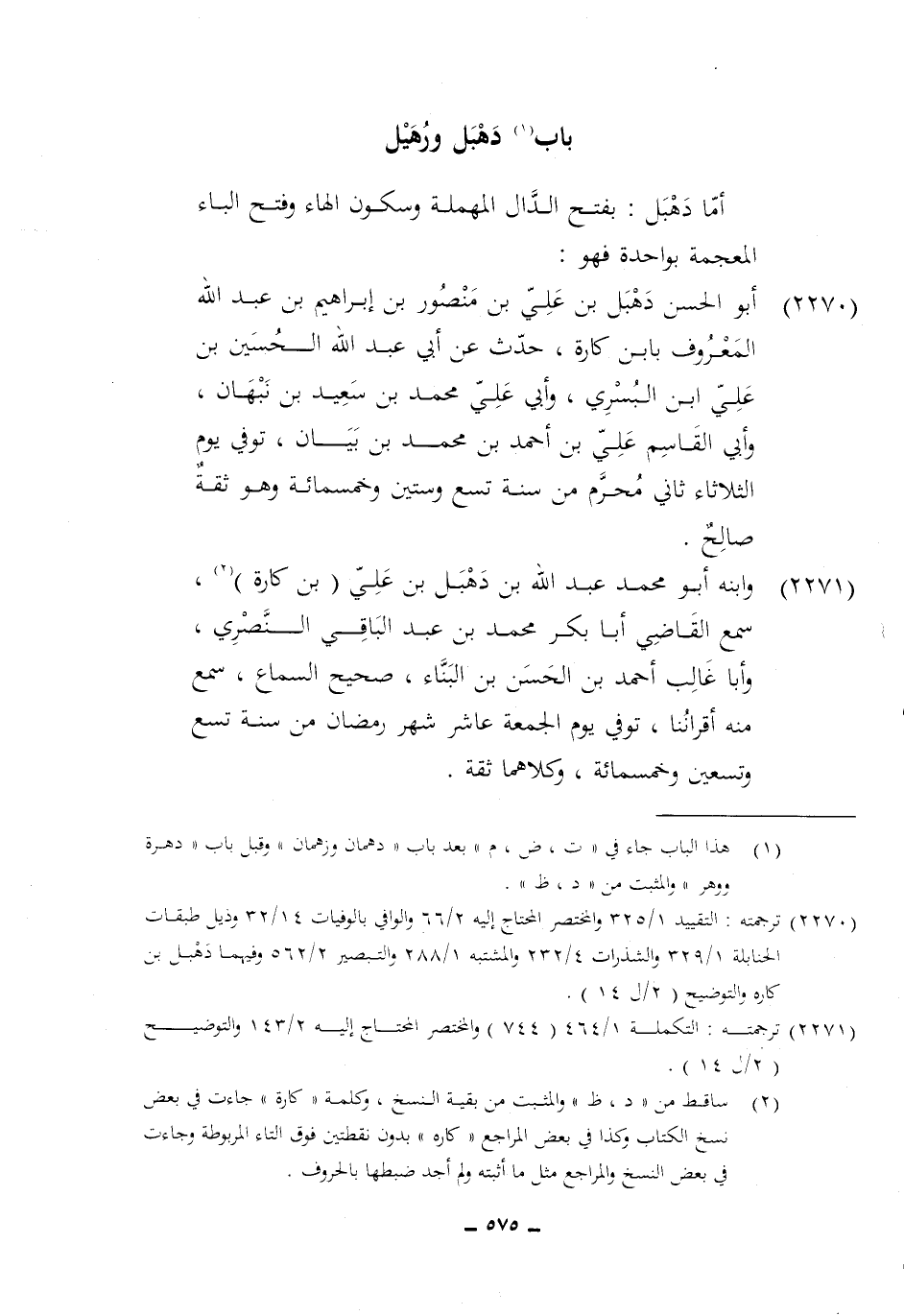 2270 - أَبُو الْحسن دهبل بن عَليّ بن مَنْصُور بن إِبْرَاهِيم بن عبد الله الْمَعْرُوف بِابْن كَارِه حدث عَن أبي عبد الله الْحُسَيْن بن عَليّ ابْن البسري وَأبي عَليّ مُحَمَّد بن سعيد بن نَبهَان وَأبي الْقَاسِم عَليّ بن أَحْمد بن مُحَمَّد بن بَيَان توفّي يَوْم الثُّلَاثَاء ثَانِي محرم من سنة تسع وَسِتِّينَ وَخَمْسمِائة وَهُوَ ثِقَة صَالح
