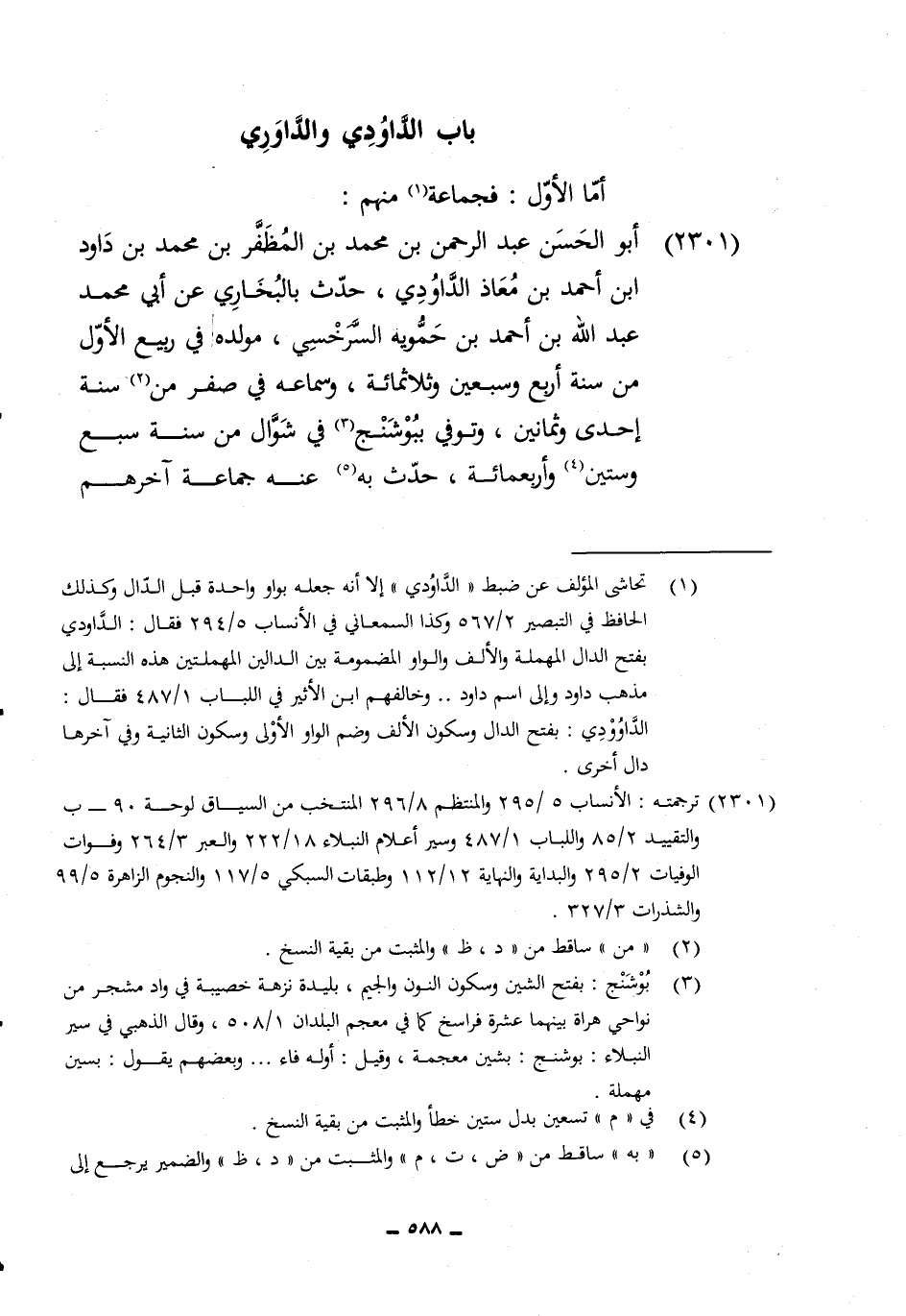 2200 - أَبُو الْحسن عبد الرَّحْمَن بن مُحَمَّد بن المظفر بن مُحَمَّد بن دَاوُد ابْن أَحْمد بن معَاذ الدَّاودِيّ حدث بالبخاري عَن أبي مُحَمَّد عبد الله بن أَحْمد بن حمويه السَّرخسِيّ مولده فِي ربيع الأول من سنة ارْبَعْ وَسبعين وثلاثمائة وسماعه فِي صفر من سنة إِحْدَى وَثَمَانِينَ وَتُوفِّي ببوشنج فِي شَوَّال من سنة سبع وَسِتِّينَ وَأَرْبَعمِائَة حدث بِهِ عَنهُ جمَاعَة آخِرهم عبد الأول بن عِيسَى بن شُعَيْب السجْزِي وَكَانَ مَوْصُوفا بِالْخَيرِ وَالتَّقوى
