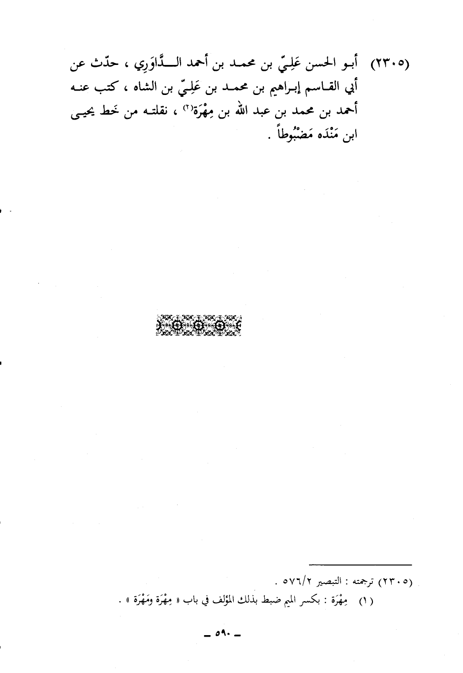 2305 - أَبُو الْحسن عَليّ بن مُحَمَّد بن أَحْمد الداوري حدث عَن أبي الْقَاسِم إِبْرَاهِيم بن مُحَمَّد بن عَليّ بن الشاه كتب عَنهُ أَحْمد بن مُحَمَّد بن عبد الله بن مهرَة نقلته من خطّ يحيى ابْن مَنْدَه مضبوطا