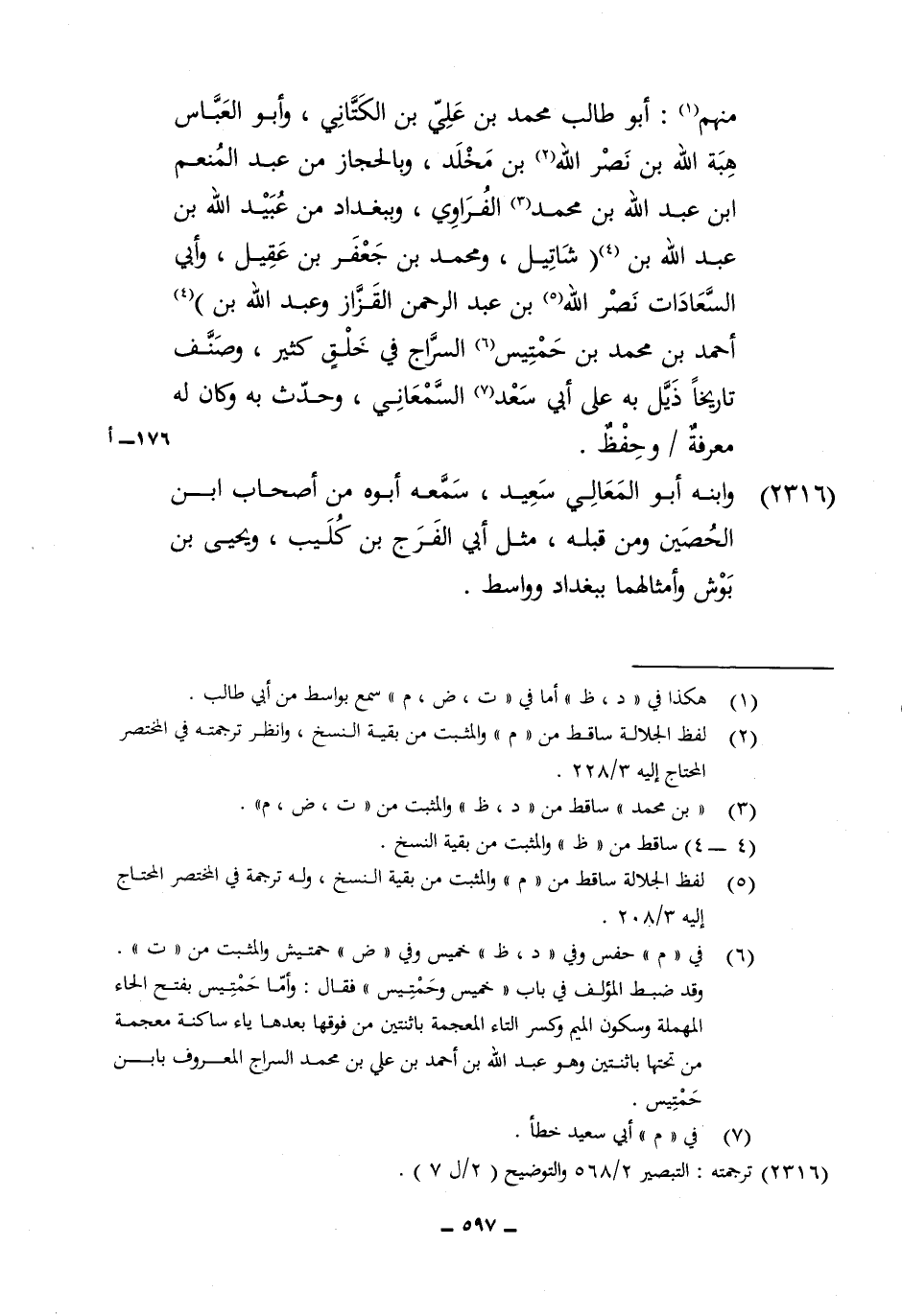 2316 - وَابْنه أَبُو الْمَعَالِي سعيد سَمعه أَبوهُ من أَصْحَاب ابْن الْحصين وَمن قبله مثل أبي الْفرج بن كُلَيْب وَيحيى بن بوش وامثالهما بِبَغْدَاد وواسط