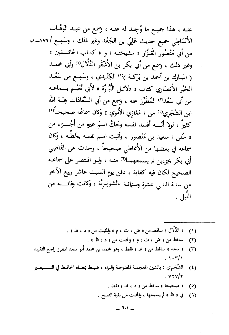 عَنهُ هَذَا جَمِيع مَا وجد لَهُ عَنهُ وَسمع من عبد الْوَهَّاب الْأنمَاطِي جَمِيع حَدِيث عَليّ بن الْجَعْد وَغير ذَلِك وَسمع من ابي مَنْصُور الْقَزاز مشيخته وَكتاب الْخَائِفِينَ وَغير ذَلِك وَسمع من أبي بكر بن الْأَشْقَر الدَّلال وَأبي مُحَمَّد الْمُبَارك بن أَحْمد بن بركَة الْكِنْدِيّ وَسمع من سعد الْخَيْر الْأنْصَارِيّ كتاب دَلَائِل النُّبُوَّة لأبي نعيم بِسَمَاعِهِ من أبي سعد الْمُطَرز عَنهُ وَسمع من أبي السعادات هبة الله ابْن الشجري من مغازي الْأمَوِي وَكَانَ سَمَاعه صَحِيحا كثيرا لَوْلَا أَنه أفسد نَفسه وحك اسْم غَيره من أَجزَاء من سنَن سعيد بن مَنْصُور وَأثبت اسْم نَفسه بِخَطِّهِ وَكَانَ سَمَاعه فِي بَعْضهَا من الْأنمَاطِي صَحِيحا وَحدث عَن القَاضِي أبي بكر بجزءين لم يسمعهما مِنْهُ وَلَو اقْتصر على سَمَاعه الصَّحِيح لَكَانَ فِيهِ كِفَايَة دفن يَوْم السبت عَاشر ربيع الآخر من سنة اثْنَتَيْ عشرَة وسِتمِائَة بالشونيزية وَكَانَت وَفَاته من اللَّيْل