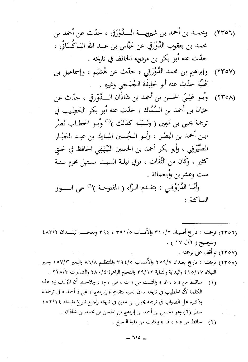 2358 - وَأَبُو عَليّ الْحسن بن أَحْمد بن شَاذان الدَّوْرَقِي حدث عَن عُثْمَان بن أَحْمد بن السماك حدث عَنهُ أَبُو بكر الْخَطِيب فِي تَرْجَمَة يحيى بن معِين وَنسبه كَذَلِك وابو الْخطاب نصر ابْن أَحْمد بن البطر وَأَبُو الْحُسَيْن الْمُبَارك بن عبد الْجَبَّار الصَّيْرَفِي وَأَبُو بكر أَحْمد بن الْحُسَيْن الْبَيْهَقِيّ الْحَافِظ فِي خلق كثير وَكَانَ من الثِّقَات توفّي لَيْلَة السبت مستهل محرم سنة سِتّ وَعشْرين وَأَرْبَعمِائَة وَأما الدروقي بتقدم الرَّاء الْمَفْتُوحَة على الْوَاو الساكنة