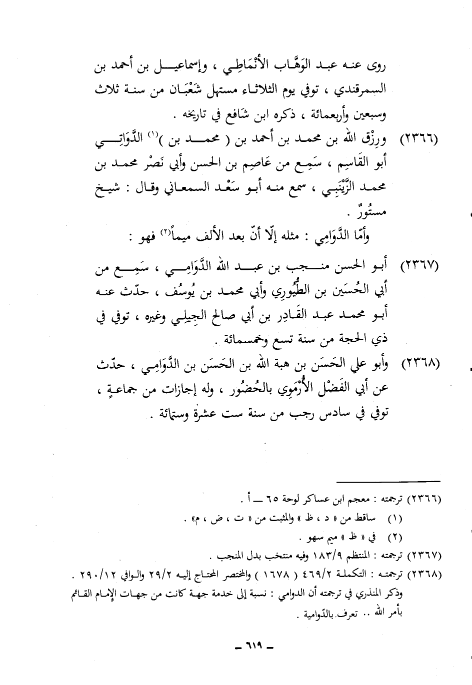 2367 - أَبُو الْحسن منجب بن عبد الله الدوامي سمع من أبي الْحُسَيْن بن الطيوري وابي مُحَمَّد بن يُوسُف حدث عَنهُ أَبُو مُحَمَّد عبد الْقَادِر بن أبي صَالح الجيلي وَغَيره توفّي فِي ذِي الْحجَّة من سنة تسع وَخَمْسمِائة
