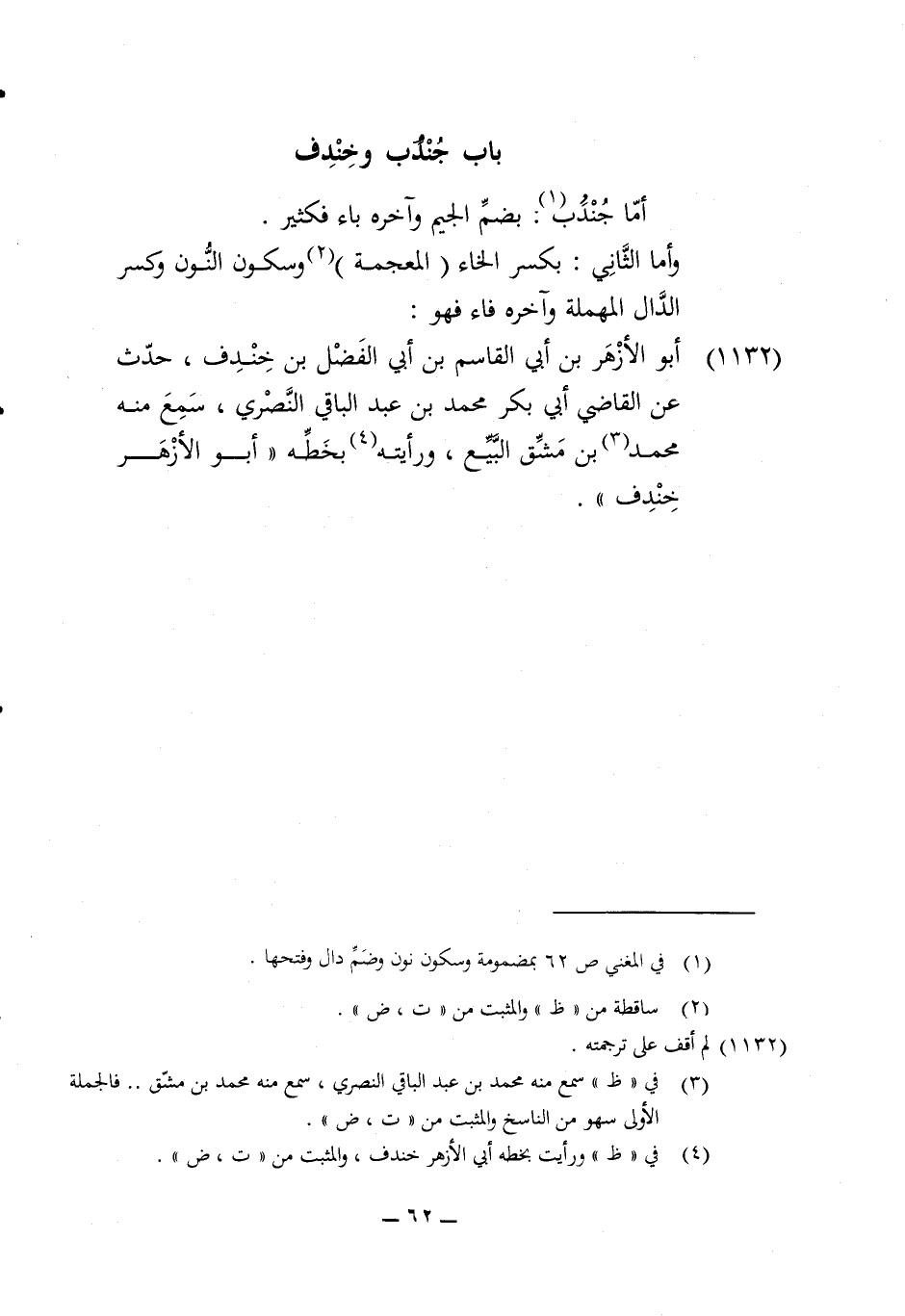 1132 - أَبُو الْأَزْهَر بن أبي الْقَاسِم بن أبي الْفضل بن خندف حدث عَن القَاضِي أبي بكر مُحَمَّد بن عبد الْبَاقِي النصري سمع مِنْهُ مُحَمَّد بن مشق البيع ورأيته بِخَطِّهِ ابو الْأَزْهَر خندف