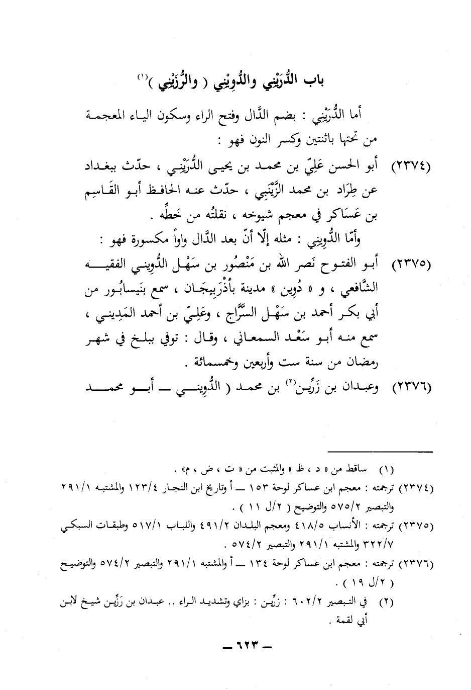 2374 - أَبُو الْحسن عَليّ بن مُحَمَّد بن يحيى الدريني حدث بِبَغْدَاد عَن طراد بن مُحَمَّد الزَّيْنَبِي حدث عَنهُ الْحَافِظ أَبُو الْقَاسِم بن عَسَاكِر فِي مُعْجم شُيُوخه نقلته من خطه